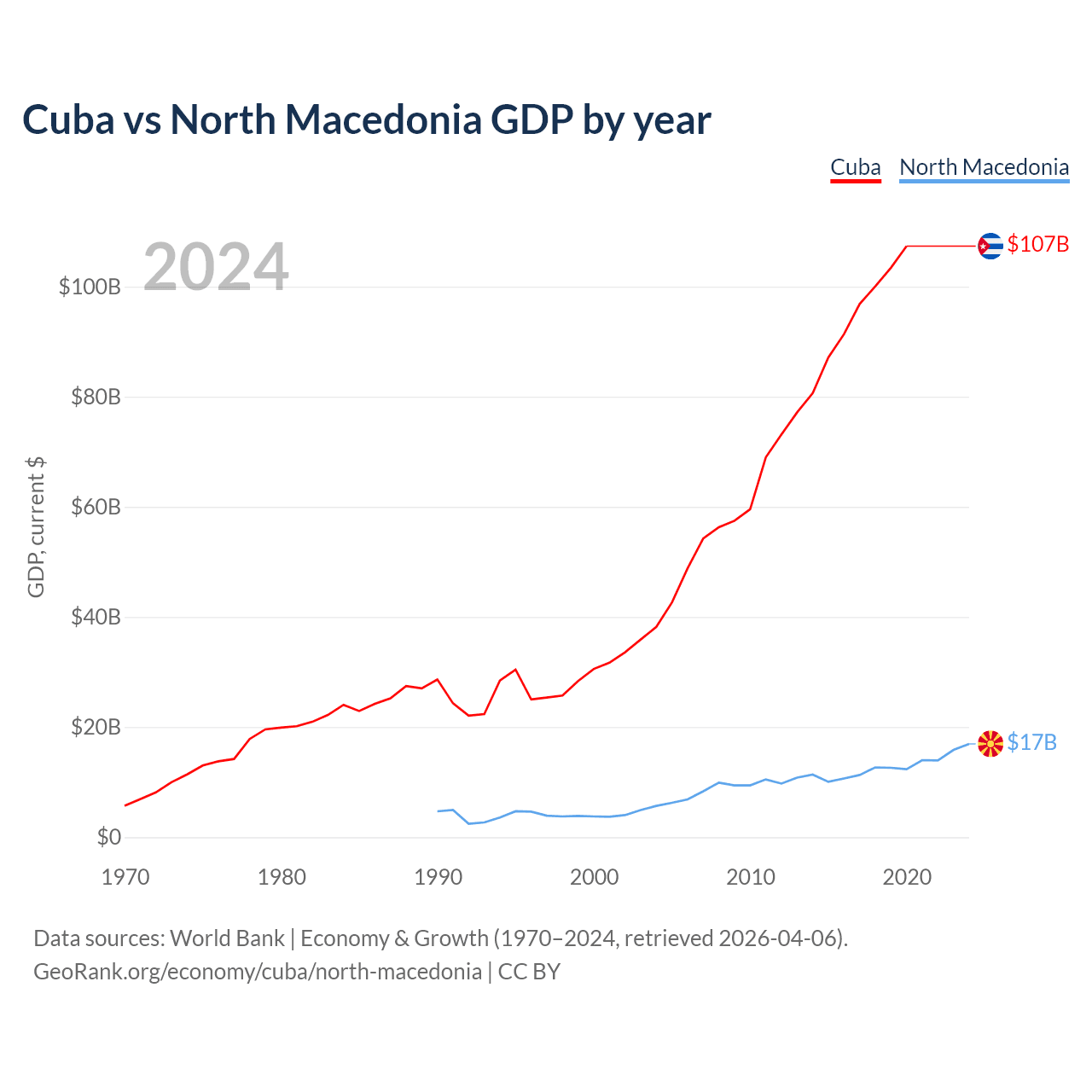 Cuba has a GDP of $107B compared to $17B for North Macedonia, ranking 69/197 and 138/197 by economy size, respectively.