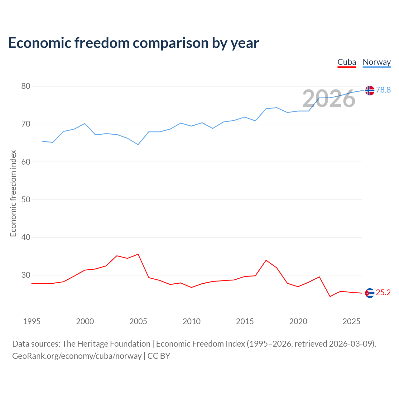 The Economic Freedom Index for Cuba is 25.2, ranking 195/197, compared to 78.8 for Norway, ranking 9/197. The chart above displays a comparison of annual changes in economic freedom indexes.