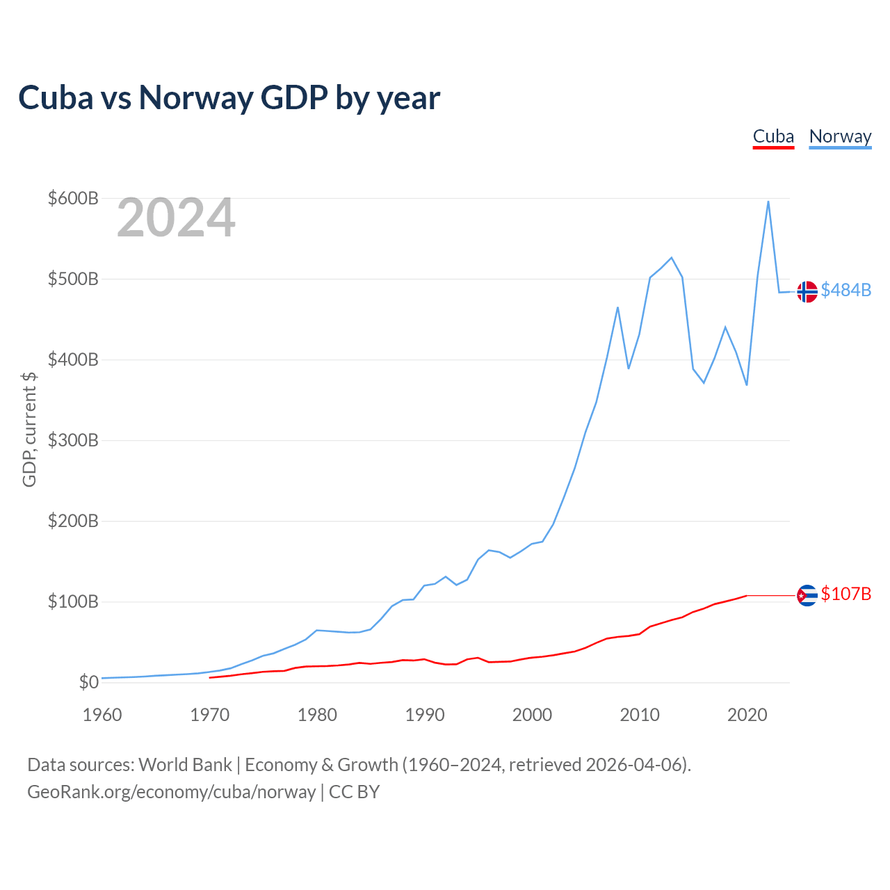 Cuba has a GDP of $107B compared to $484B for Norway, ranking 69/197 and 32/197 by economy size, respectively.