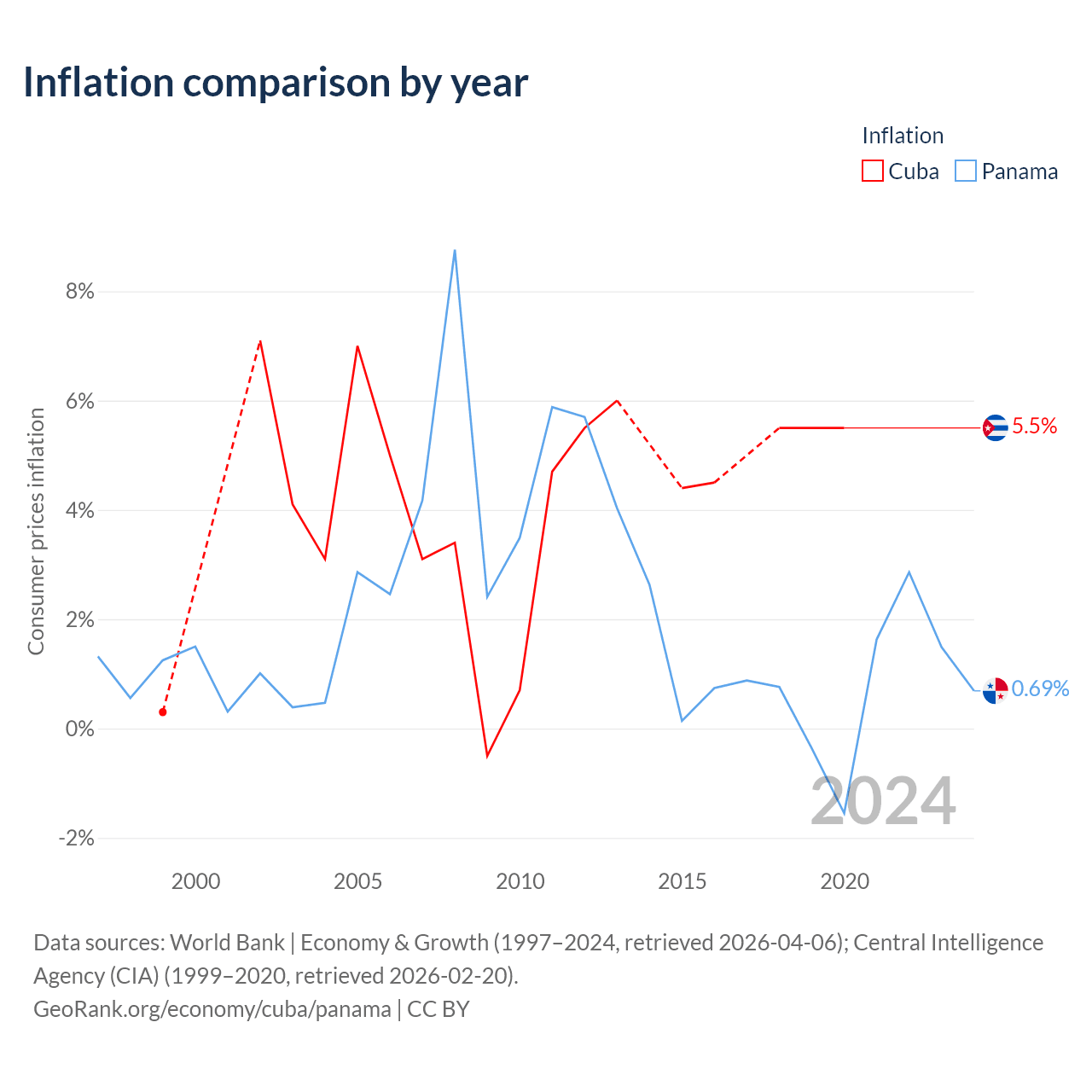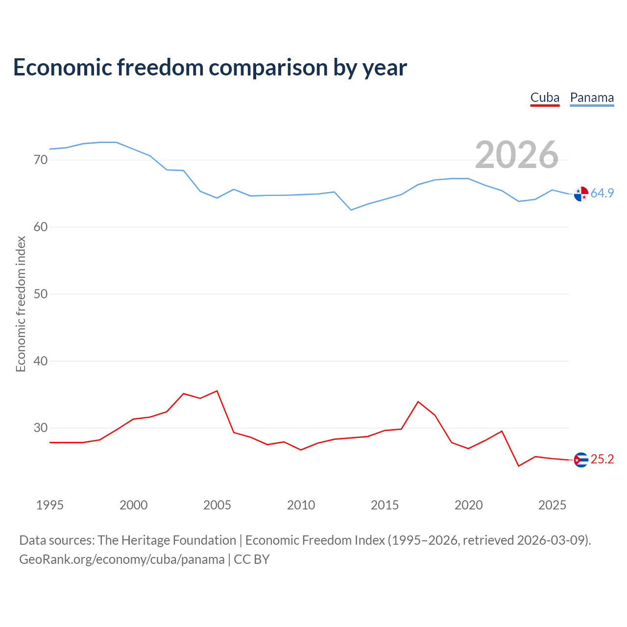 The Economic Freedom Index for Cuba is 25.2, ranking 195/197, compared to 64.9 for Panama, ranking 70/197. The chart above displays a comparison of annual changes in economic freedom indexes.