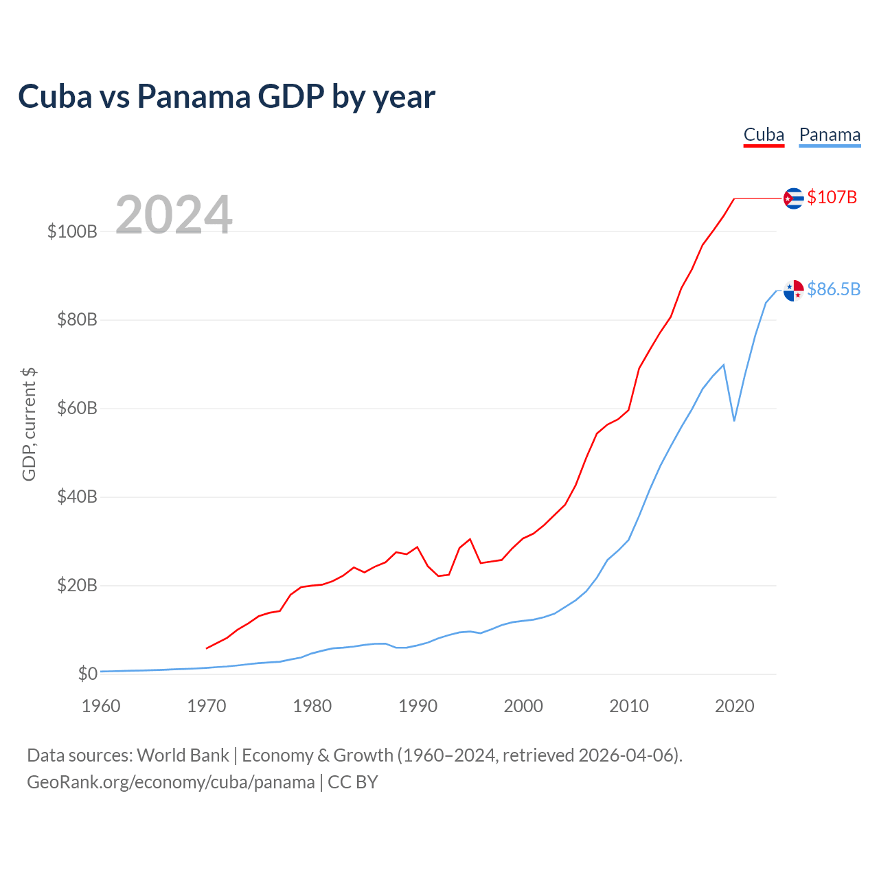 Cuba has a GDP of $107B compared to $86.5B for Panama, ranking 69/197 and 78/197 by economy size, respectively.