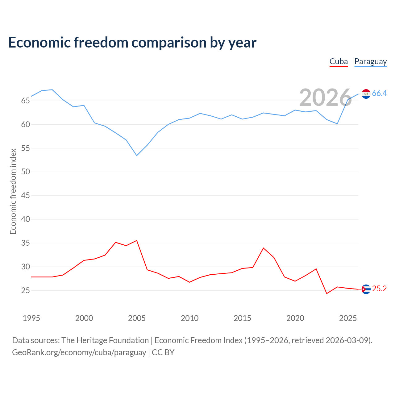 The Economic Freedom Index for Cuba is 25.2, ranking 195/197, compared to 66.4 for Paraguay, ranking 61/197. The chart above displays a comparison of annual changes in economic freedom indexes.