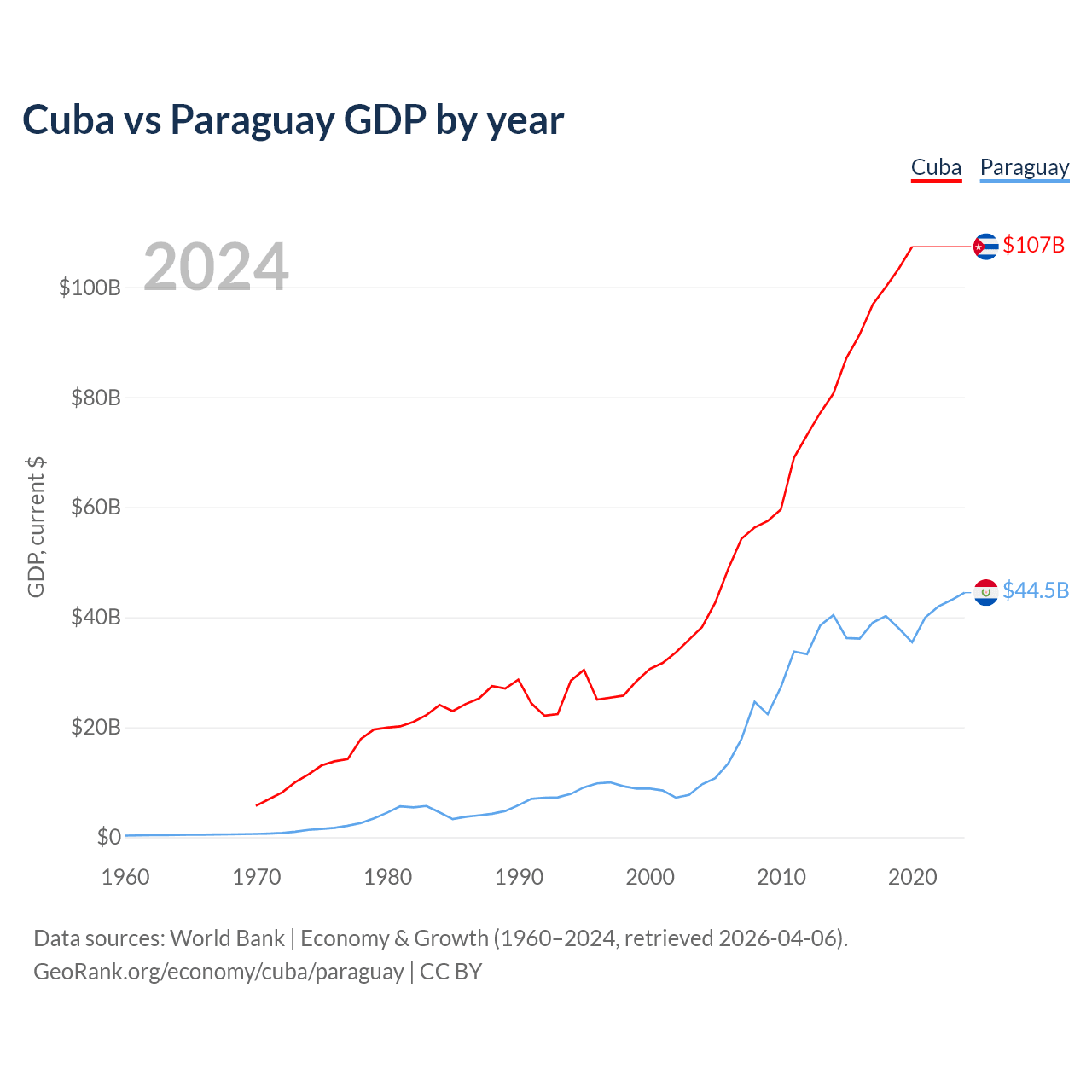 Cuba has a GDP of $107B compared to $44.5B for Paraguay, ranking 69/197 and 98/197 by economy size, respectively.