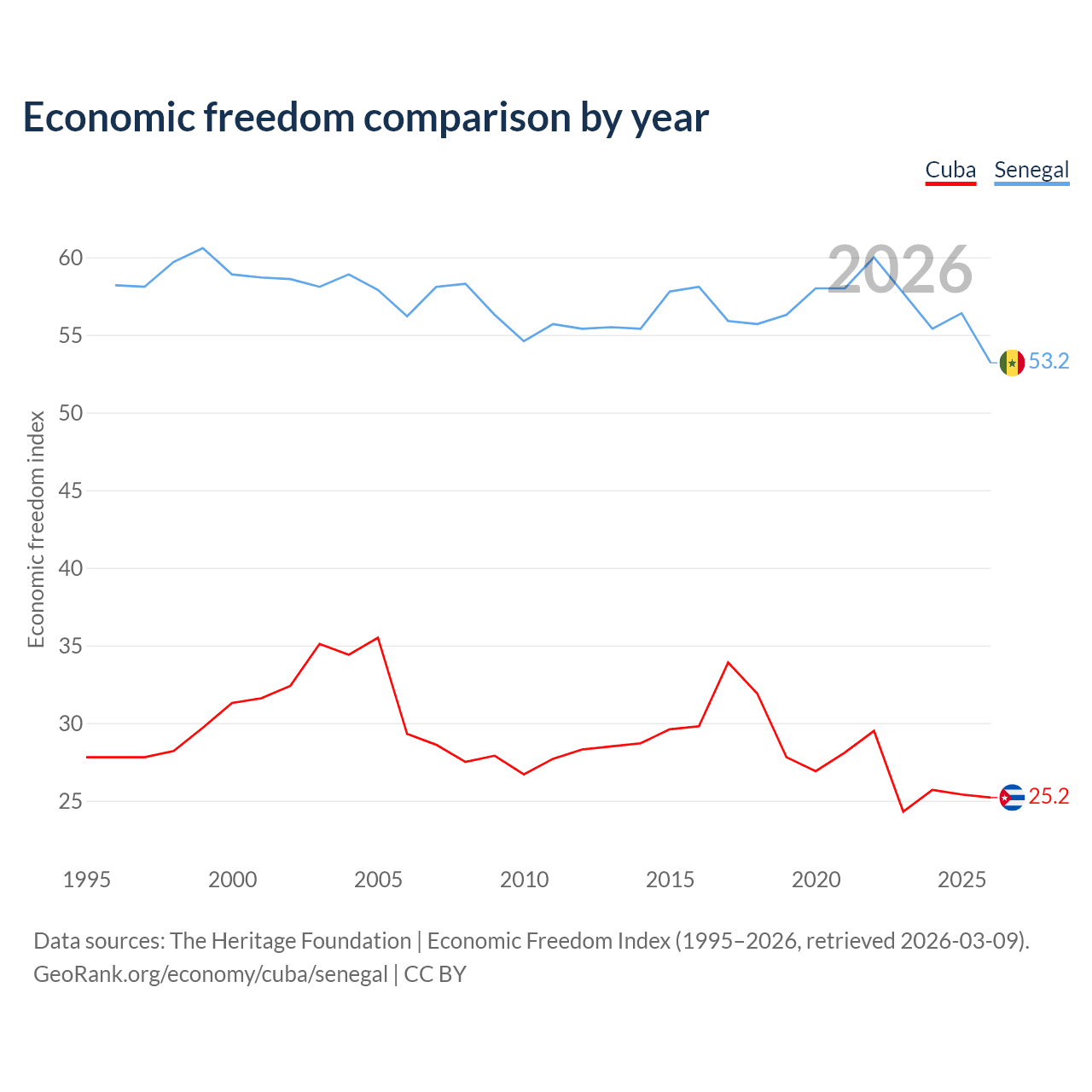 The Economic Freedom Index for Cuba is 25.2, ranking 195/197, compared to 53.2 for Senegal, ranking 140/197. The chart above displays a comparison of annual changes in economic freedom indexes.