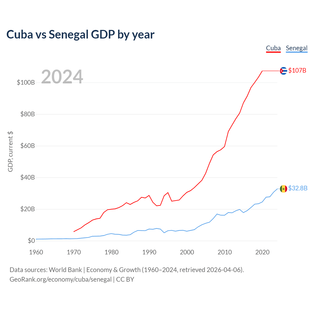 Cuba has a GDP of $107B compared to $32.8B for Senegal, ranking 69/197 and 109/197 by economy size, respectively.