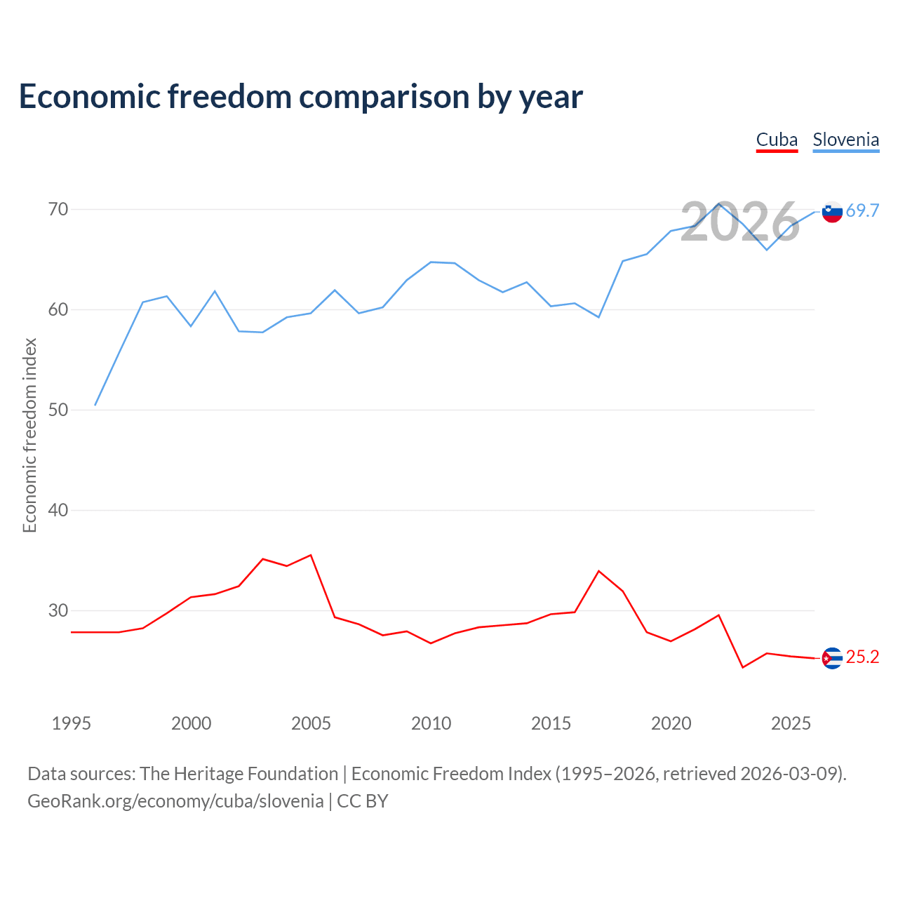 The Economic Freedom Index for Cuba is 25.2, ranking 195/197, compared to 69.7 for Slovenia, ranking 40/197. The chart above displays a comparison of annual changes in economic freedom indexes.