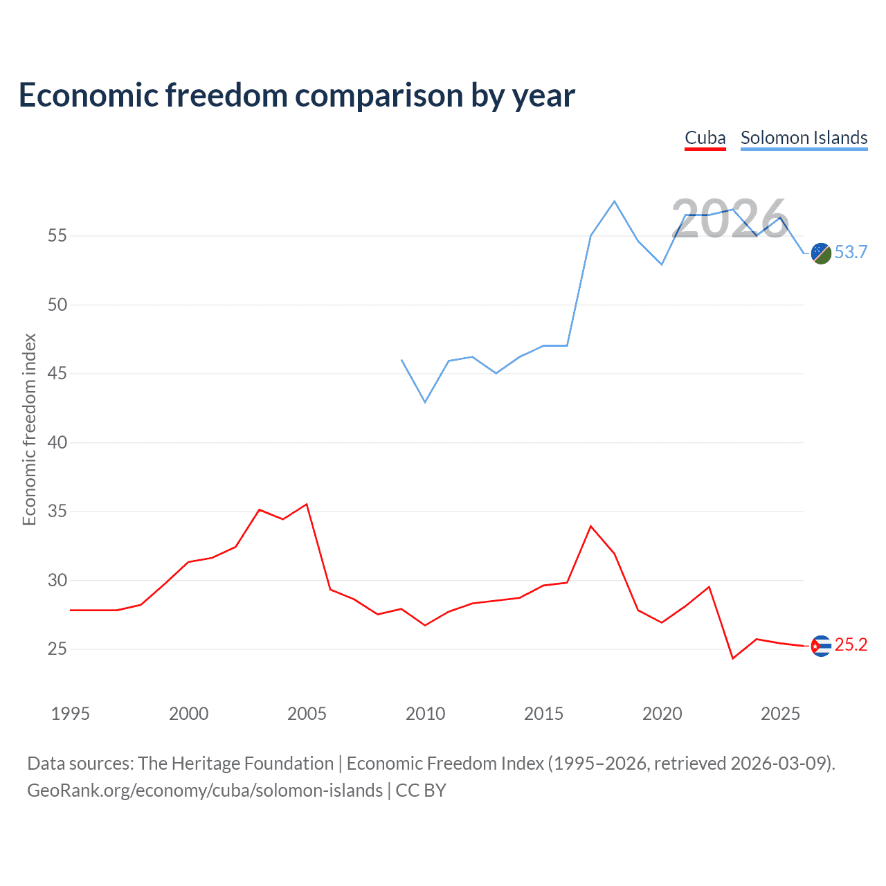 The Economic Freedom Index for Cuba is 25.2, ranking 195/197, compared to 53.7 for the Solomon Islands, ranking 137/197. The chart above displays a comparison of annual changes in economic freedom indexes.