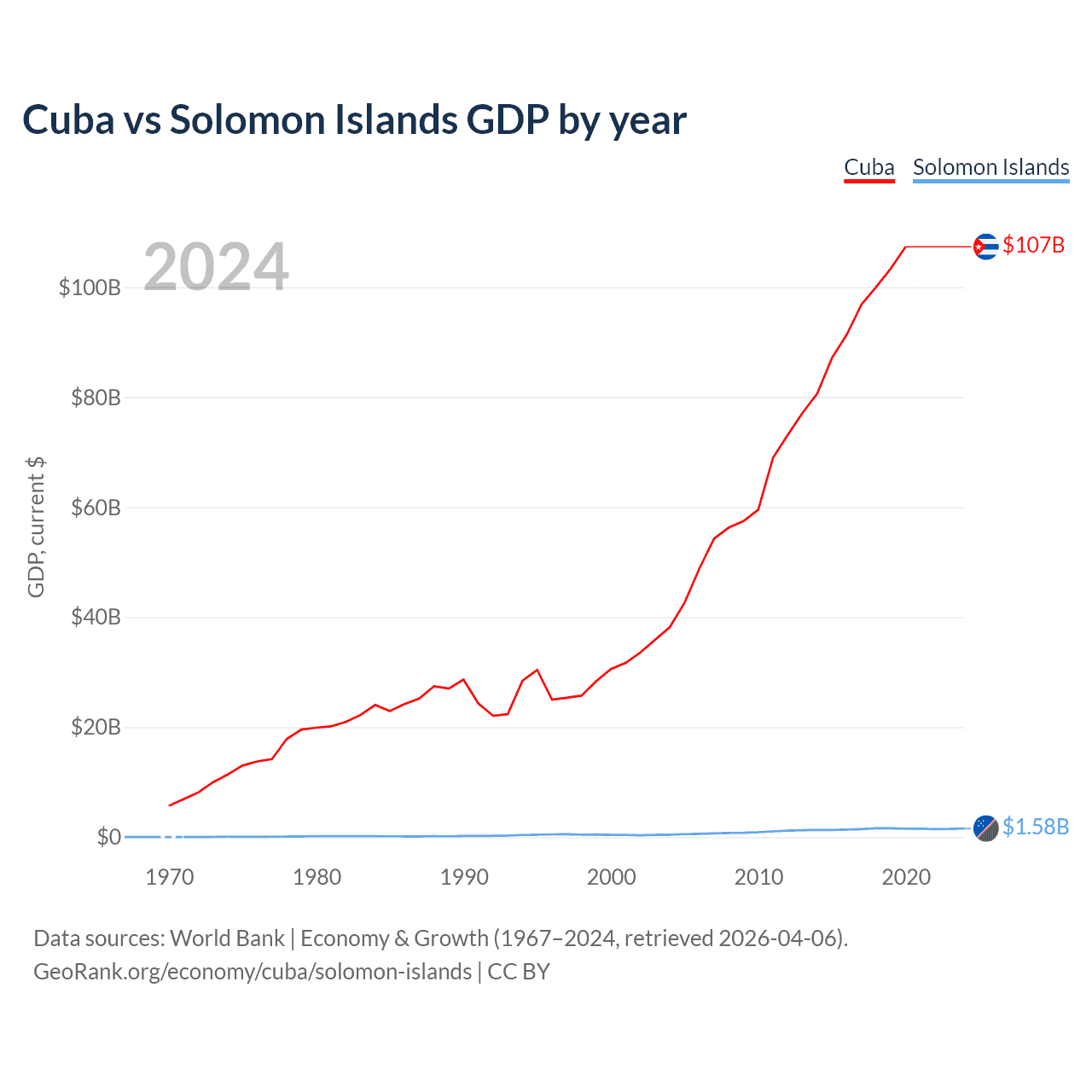 Cuba has a GDP of $107B compared to $1.58B for the Solomon Islands, ranking 69/197 and 182/197 by economy size, respectively.