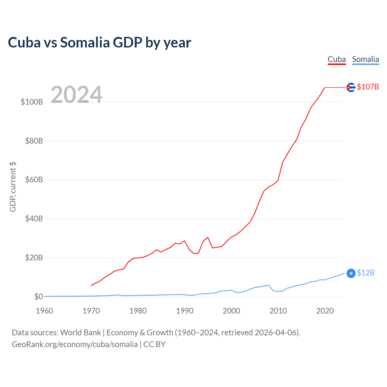 Cuba has a GDP of $107B compared to $12B for Somalia, ranking 69/197 and 150/197 by economy size, respectively.
