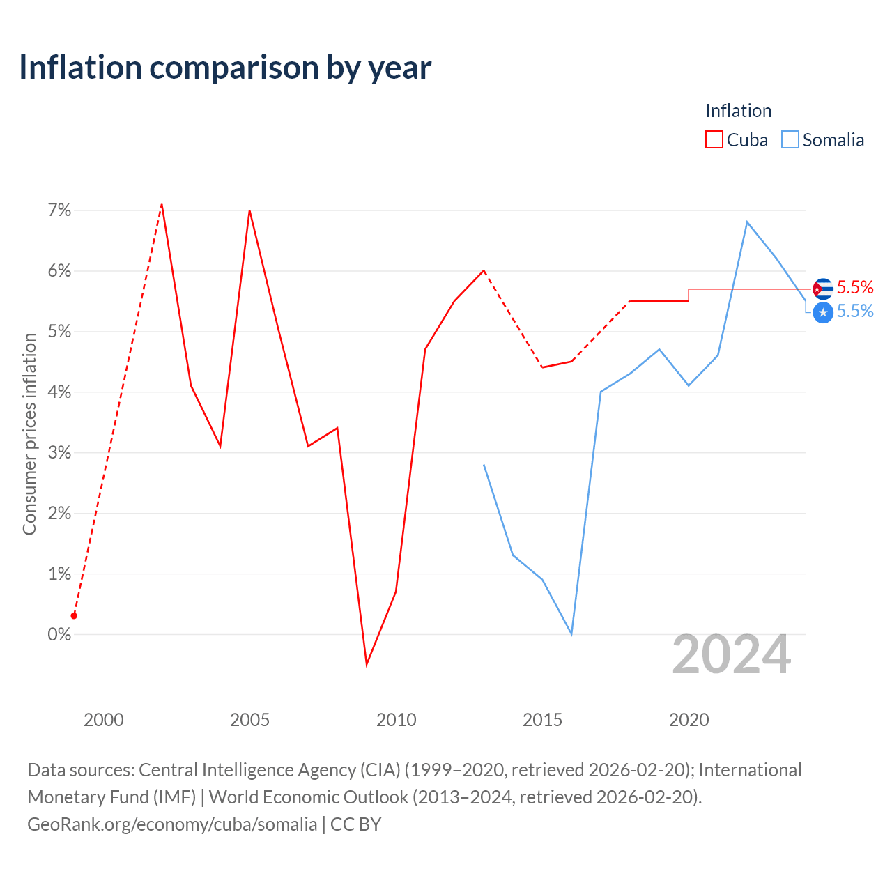 Over the past 8 years, Cuba has recorded an average annual inflation rate of 5.23%, compared with 2.76% in Somalia. In 2020, inflation was 5.5% in Cuba and 5.5% in Somalia.