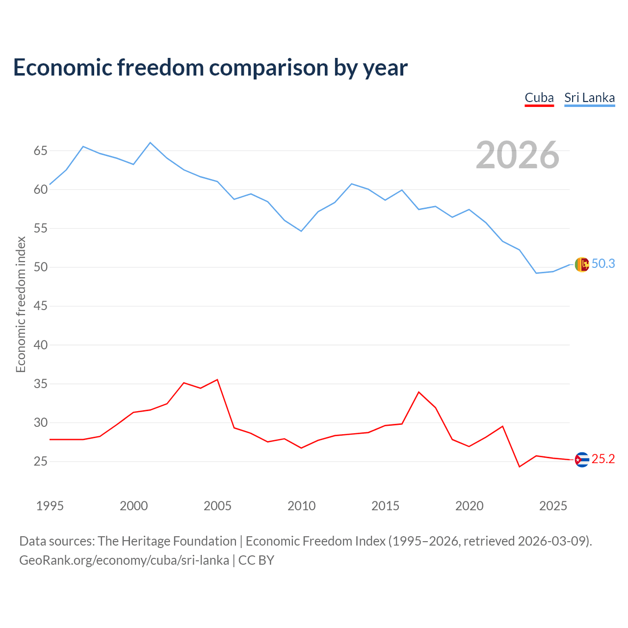 The Economic Freedom Index for Cuba is 25.2, ranking 195/197, compared to 50.3 for Sri Lanka, ranking 162/197. The chart above displays a comparison of annual changes in economic freedom indexes.