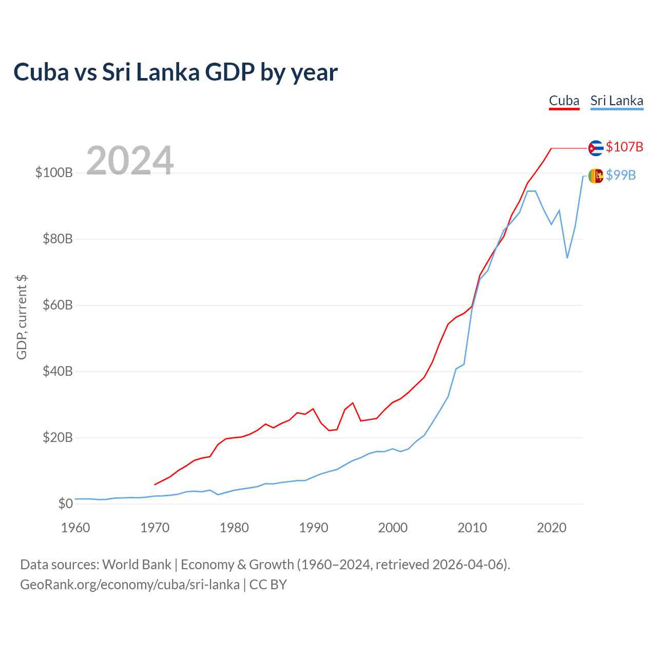 Cuba has a GDP of $107B compared to $99B for Sri Lanka, ranking 69/197 and 72/197 by economy size, respectively.