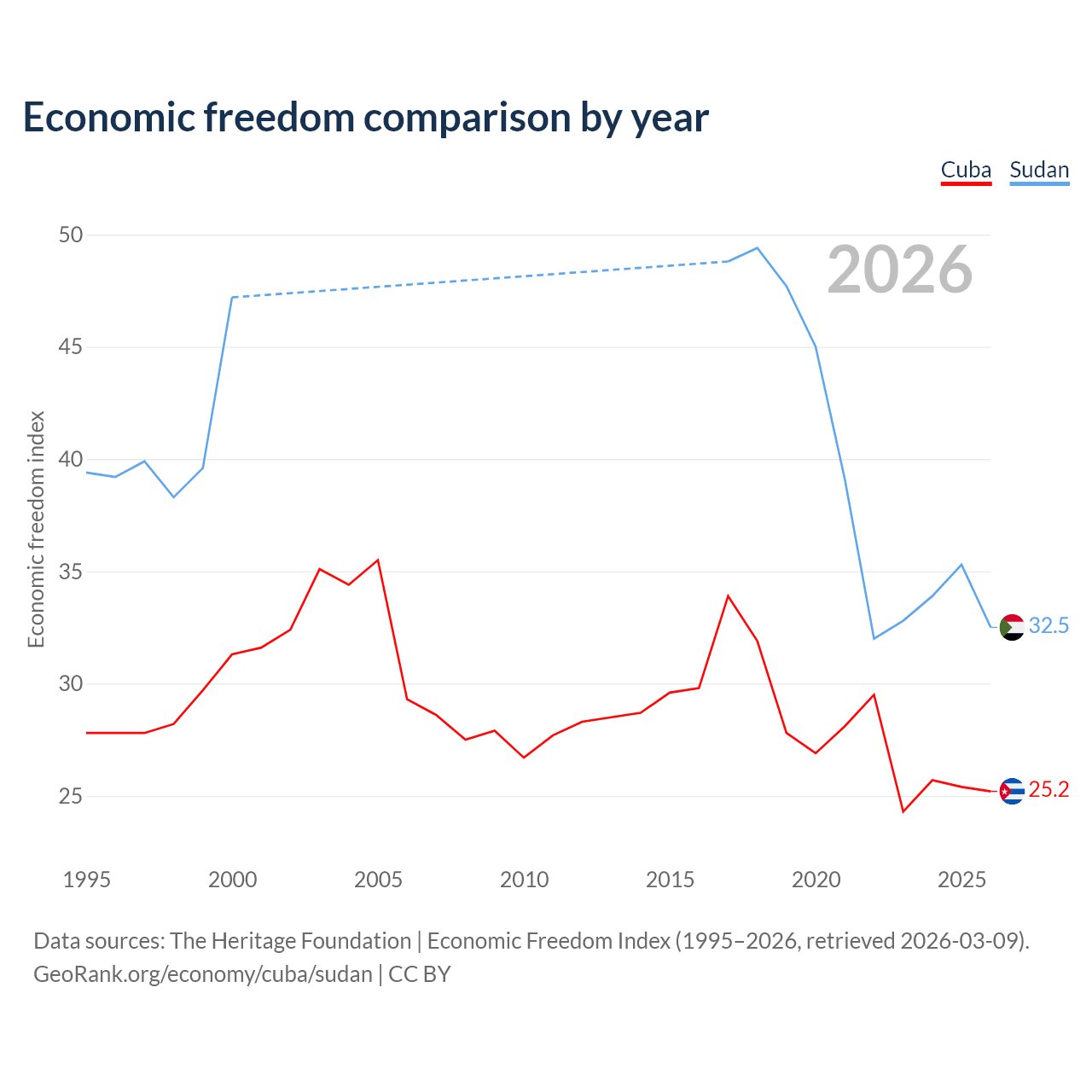 The Economic Freedom Index for Cuba is 25.2, ranking 195/197, compared to 32.5 for Sudan, ranking 191/197. The chart above displays a comparison of annual changes in economic freedom indexes.