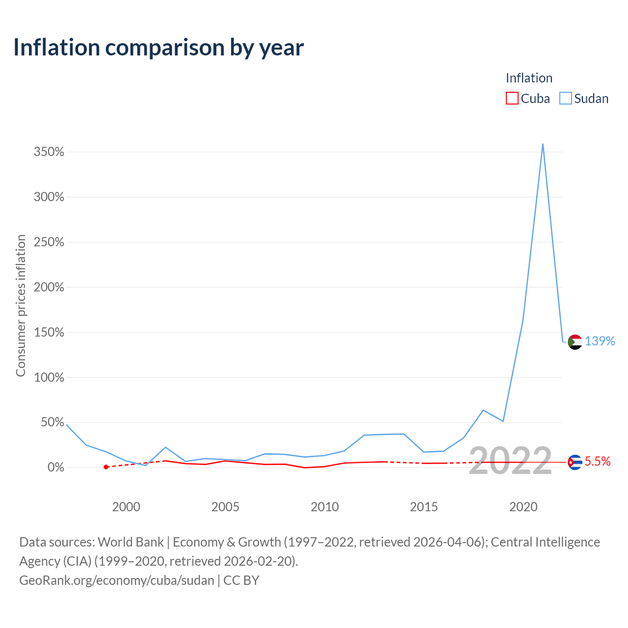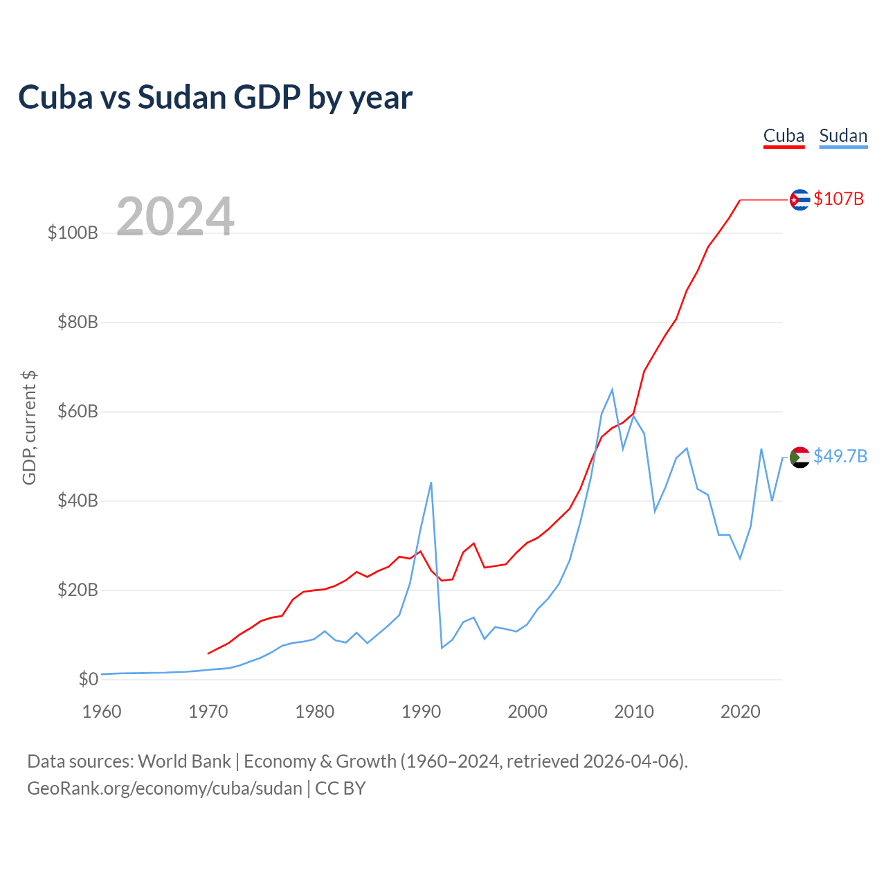Cuba has a GDP of $107B compared to $49.7B for Sudan, ranking 69/197 and 94/197 by economy size, respectively.