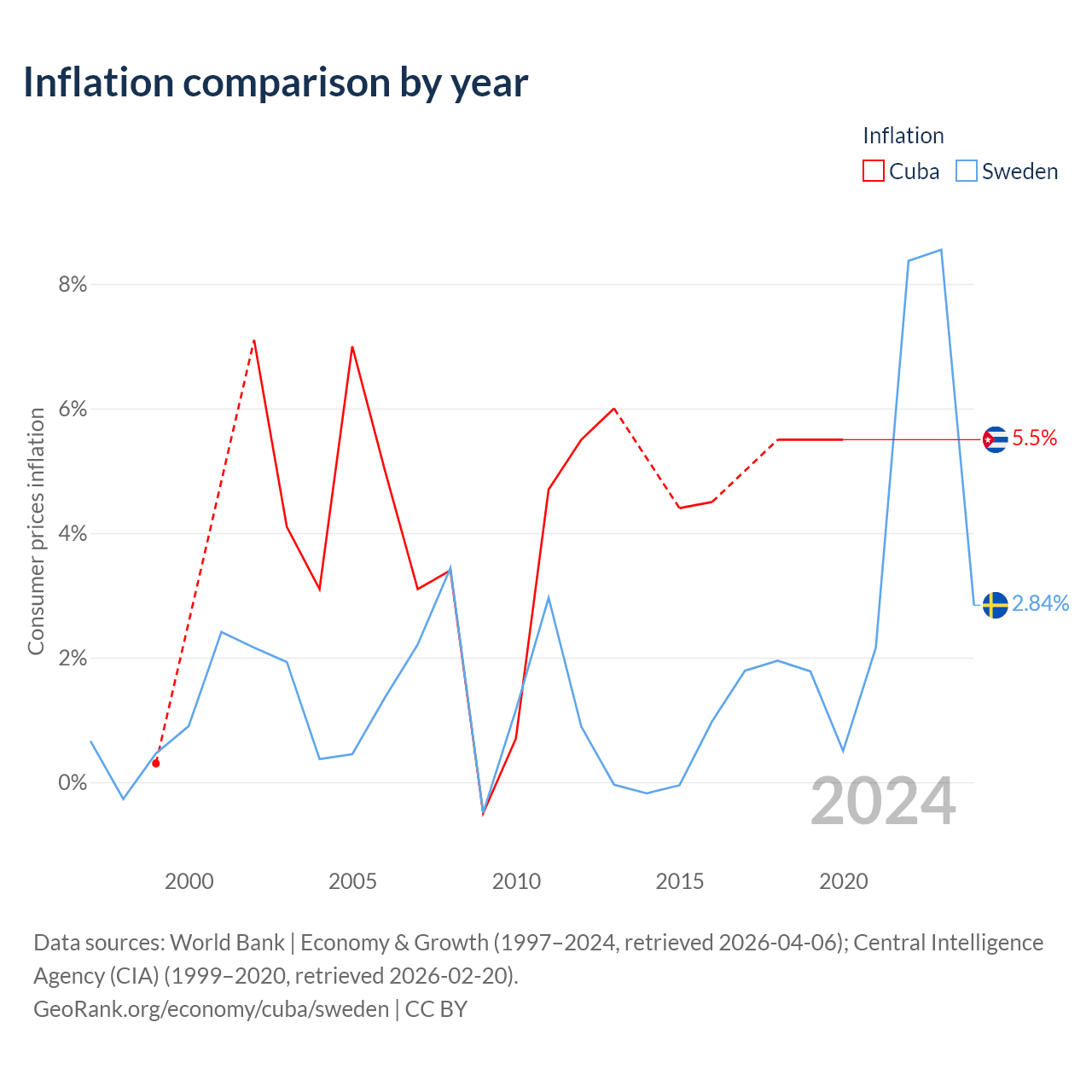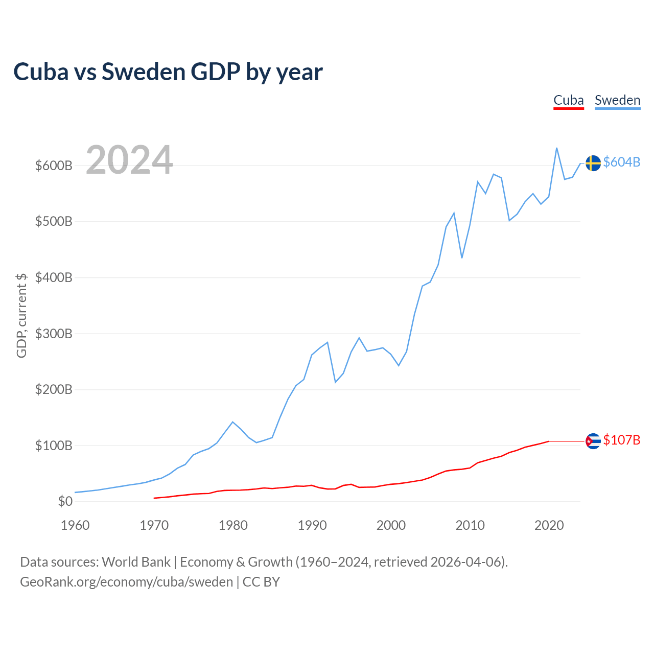 Cuba has a GDP of $107B compared to $604B for Sweden, ranking 69/197 and 26/197 by economy size, respectively.