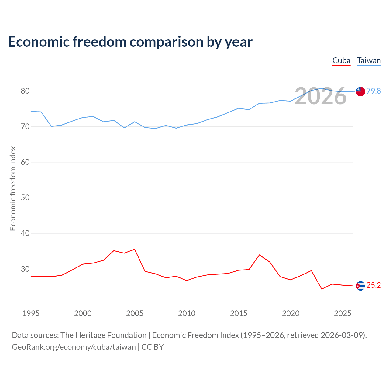 The Economic Freedom Index for Cuba is 25.2, ranking 195/197, compared to 79.8 for Taiwan, ranking 6/197. The chart above displays a comparison of annual changes in economic freedom indexes.