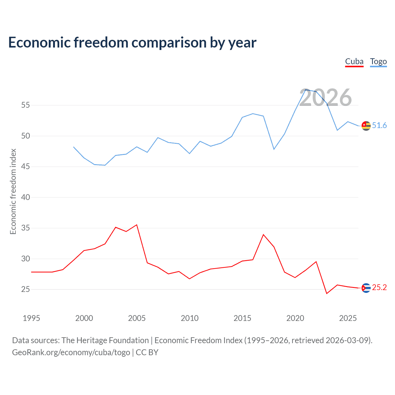 The Economic Freedom Index for Cuba is 25.2, ranking 195/197, compared to 51.6 for Togo, ranking 153/197. The chart above displays a comparison of annual changes in economic freedom indexes.
