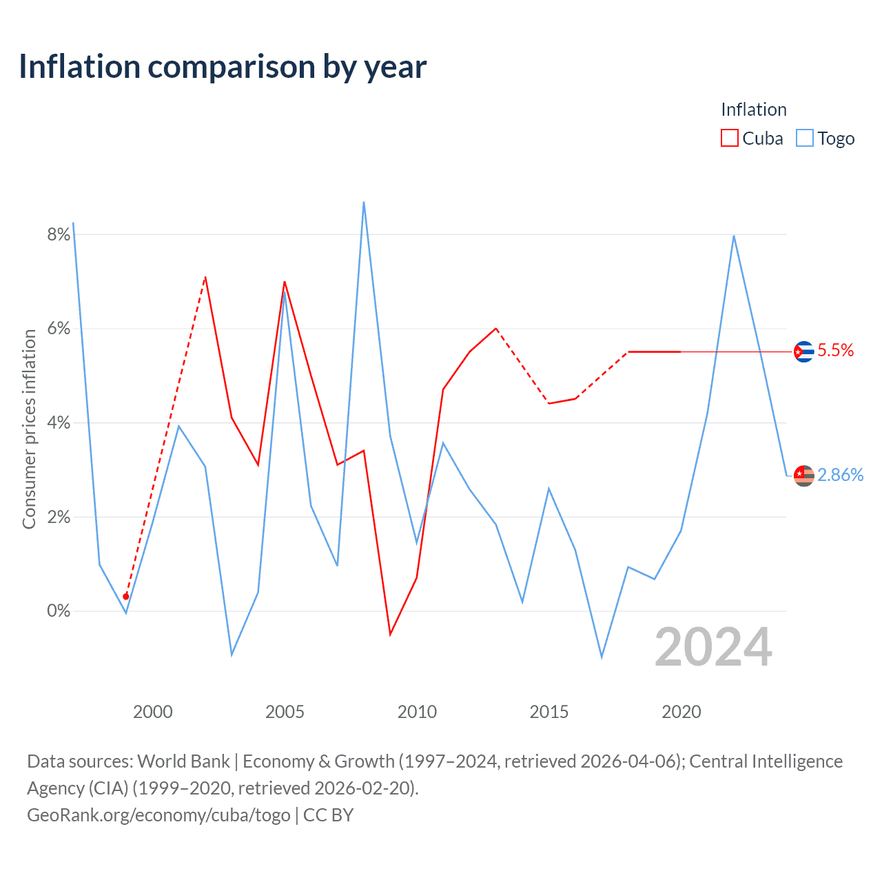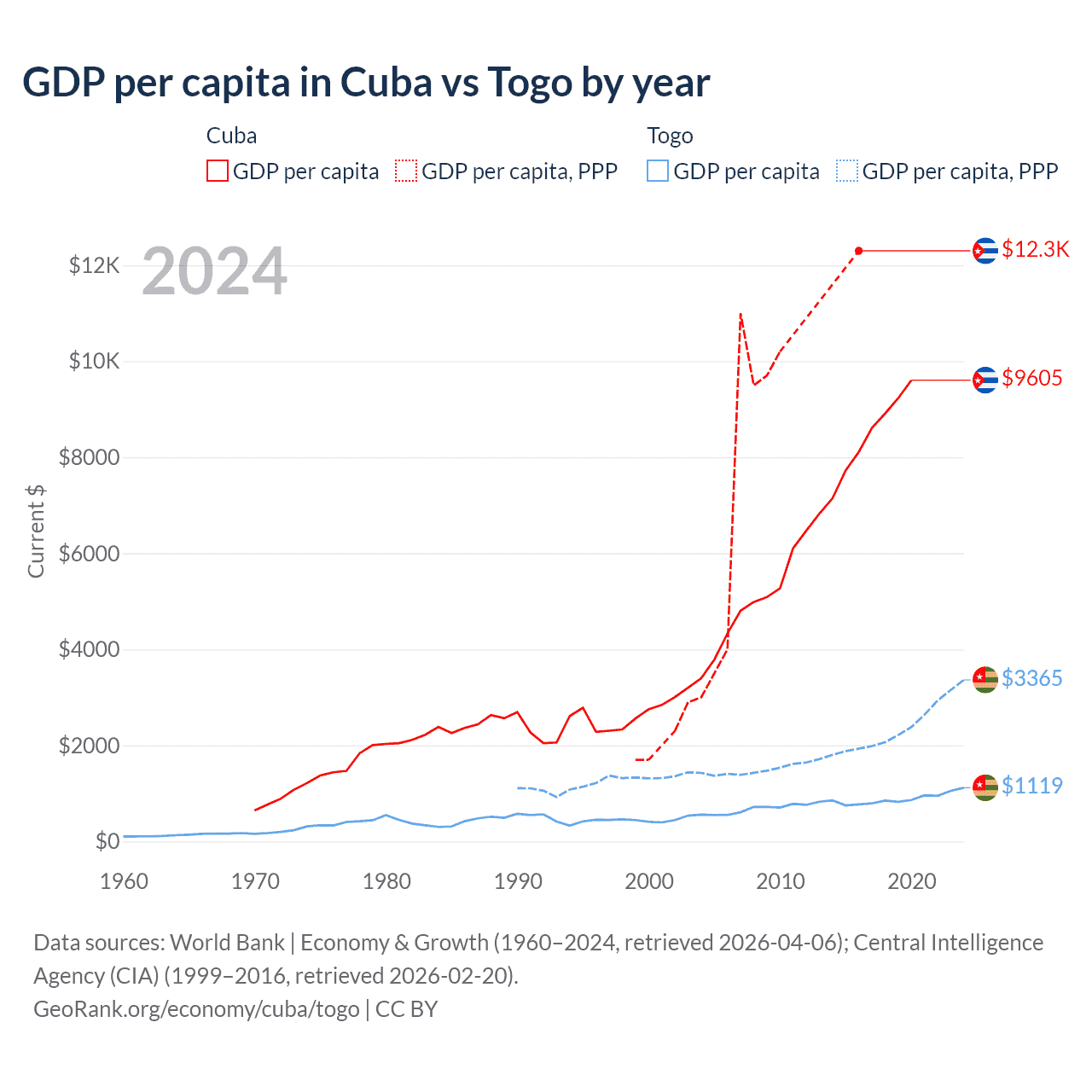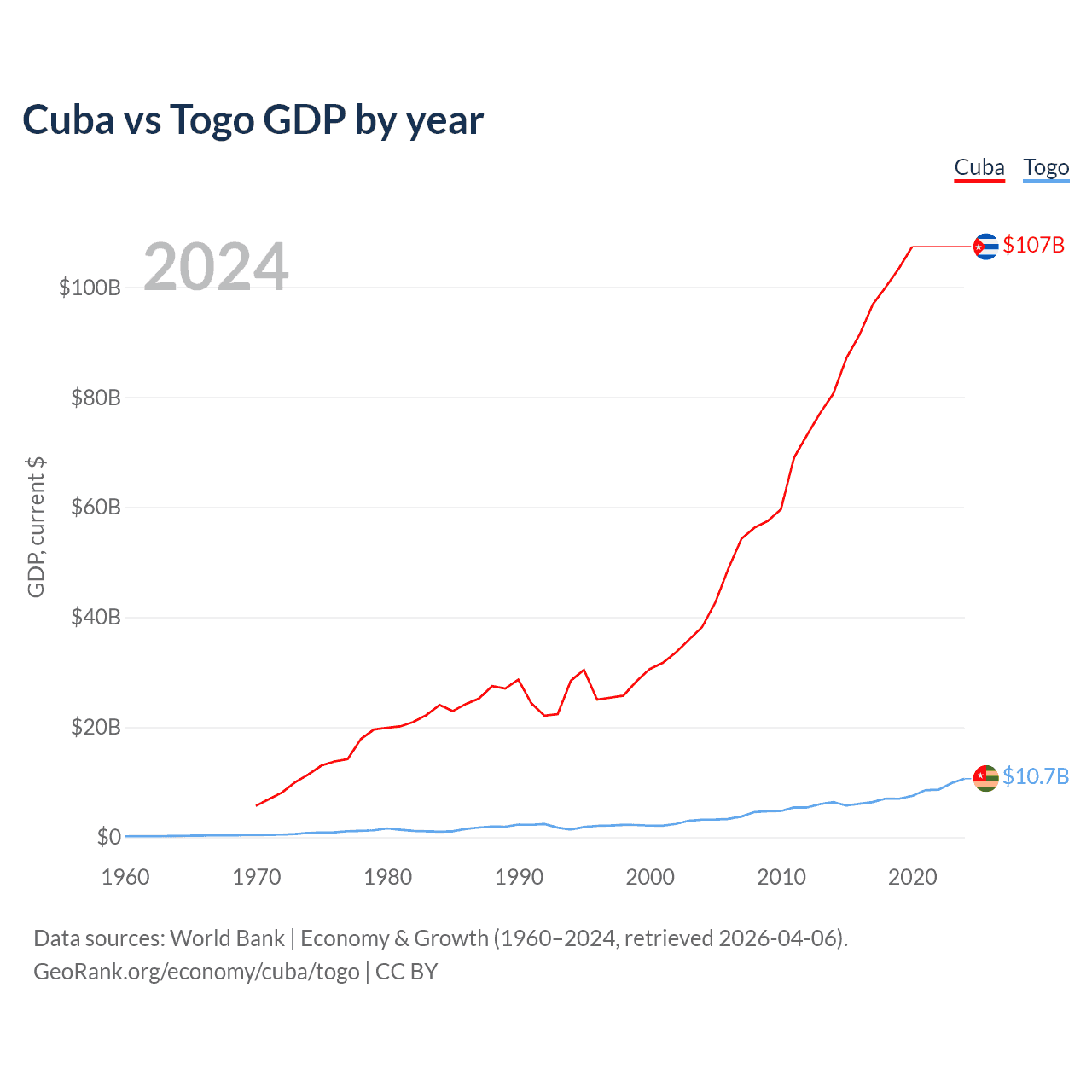 Cuba has a GDP of $107B compared to $10.7B for Togo, ranking 69/197 and 154/197 by economy size, respectively.