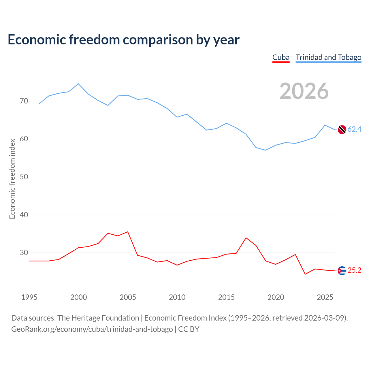 The Economic Freedom Index for Cuba is 25.2, ranking 195/197, compared to 62.4 for Trinidad and Tobago, ranking 87/197. The chart above displays a comparison of annual changes in economic freedom indexes.