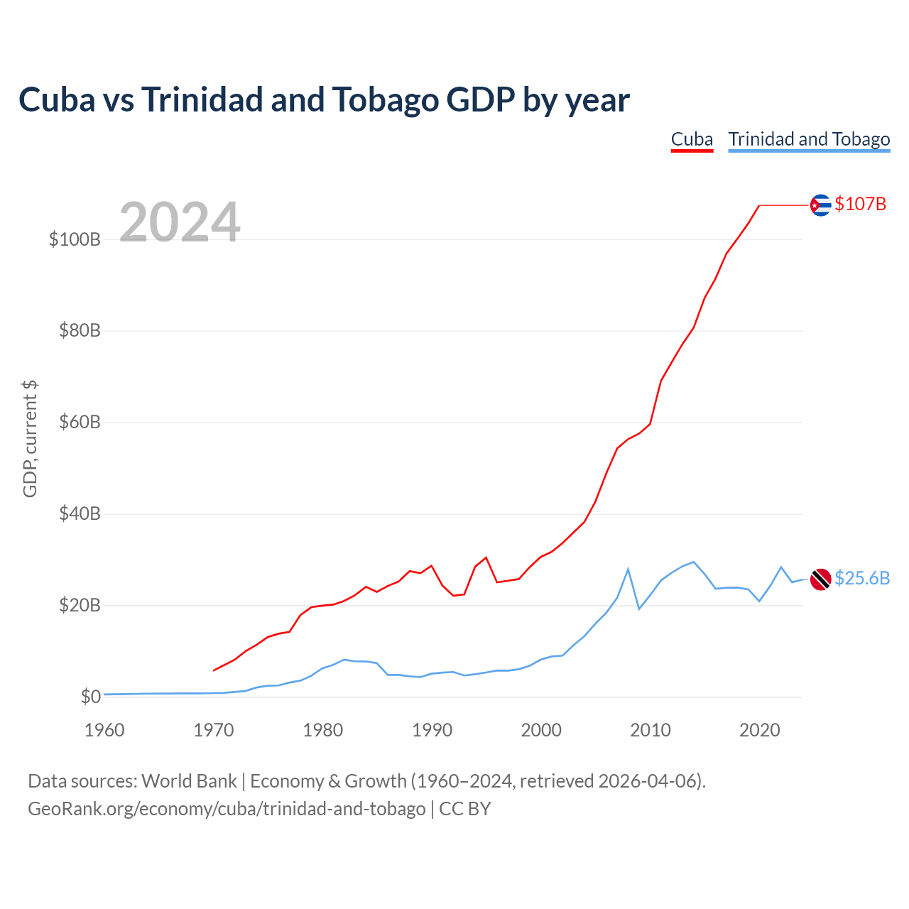 Cuba has a GDP of $107B compared to $25.6B for Trinidad and Tobago, ranking 69/197 and 115/197 by economy size, respectively.