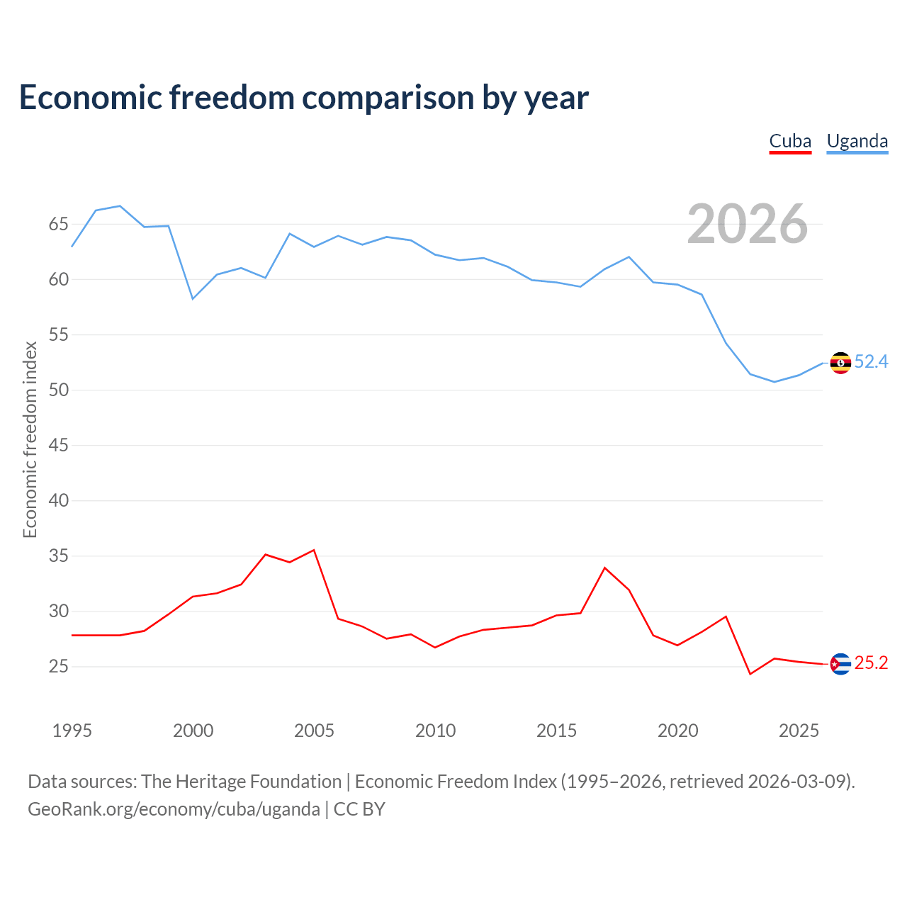 The Economic Freedom Index for Cuba is 25.2, ranking 195/197, compared to 52.4 for Uganda, ranking 149/197. The chart above displays a comparison of annual changes in economic freedom indexes.