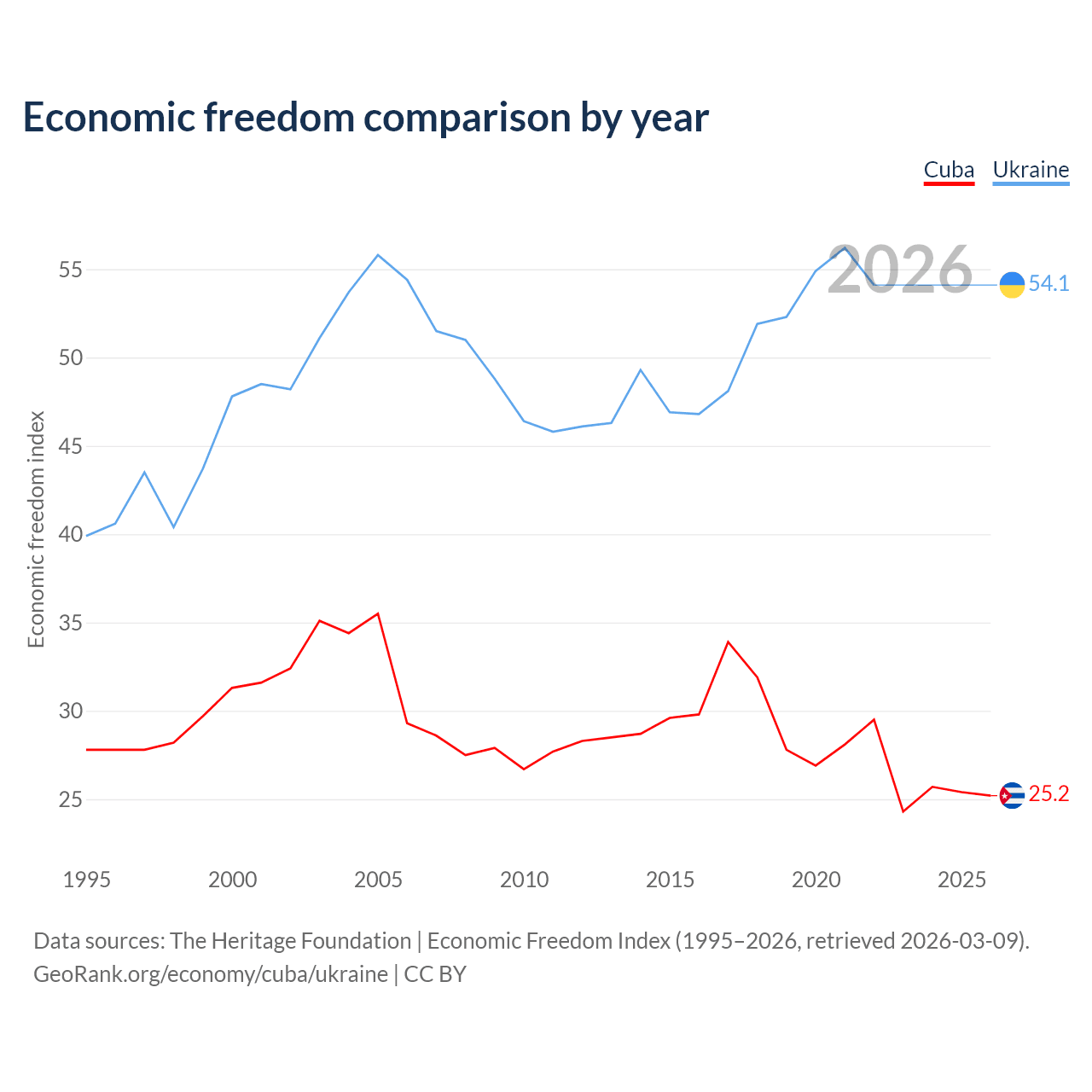 The Economic Freedom Index for Cuba is 25.2, ranking 195/197, compared to 54.1 for Ukraine, ranking 135/197. The chart above displays a comparison of annual changes in economic freedom indexes.