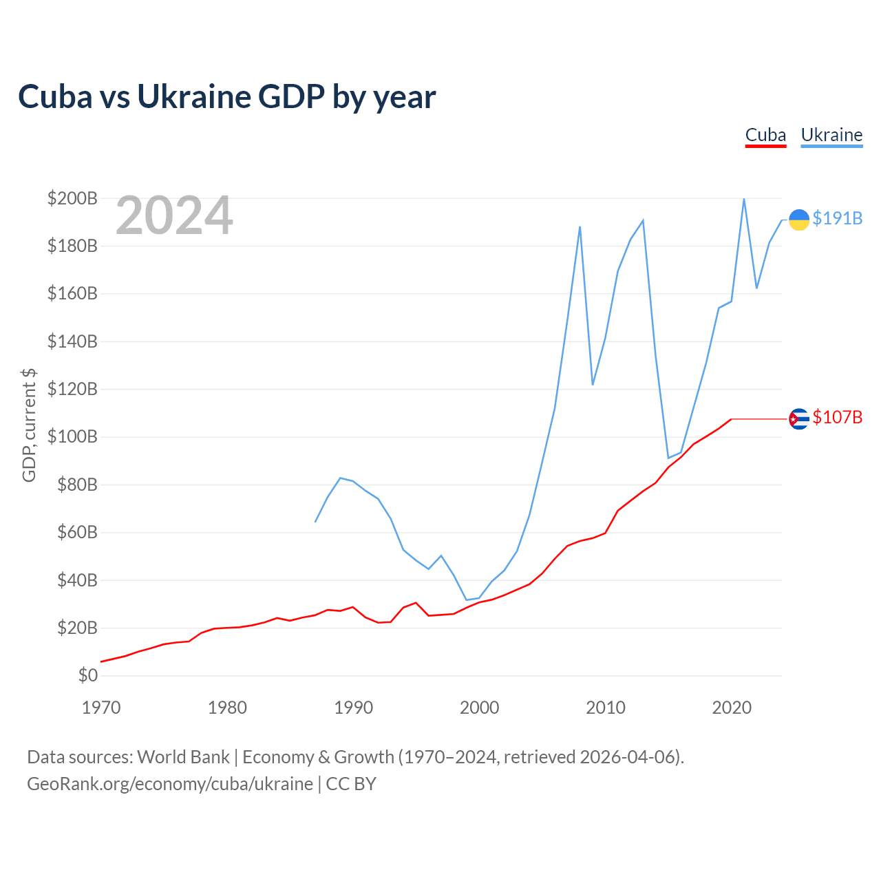Cuba has a GDP of $107B compared to $191B for Ukraine, ranking 69/197 and 57/197 by economy size, respectively.