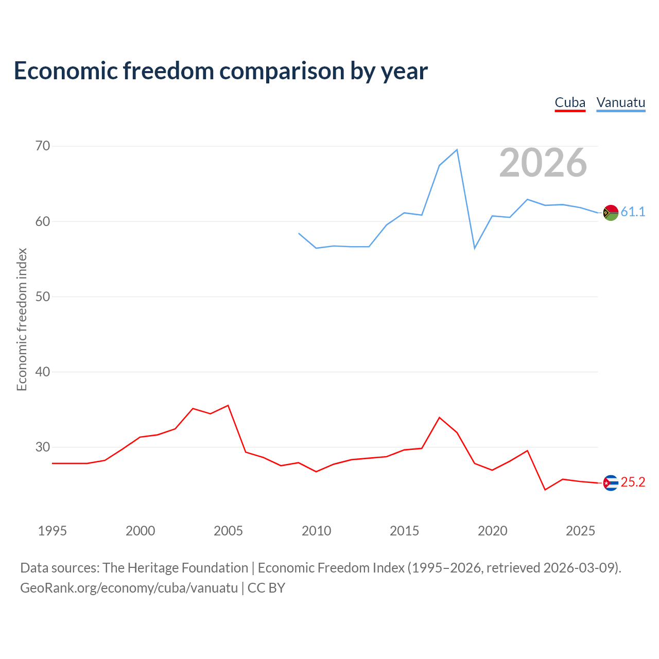 The Economic Freedom Index for Cuba is 25.2, ranking 195/197, compared to 61.1 for Vanuatu, ranking 92/197. The chart above displays a comparison of annual changes in economic freedom indexes.