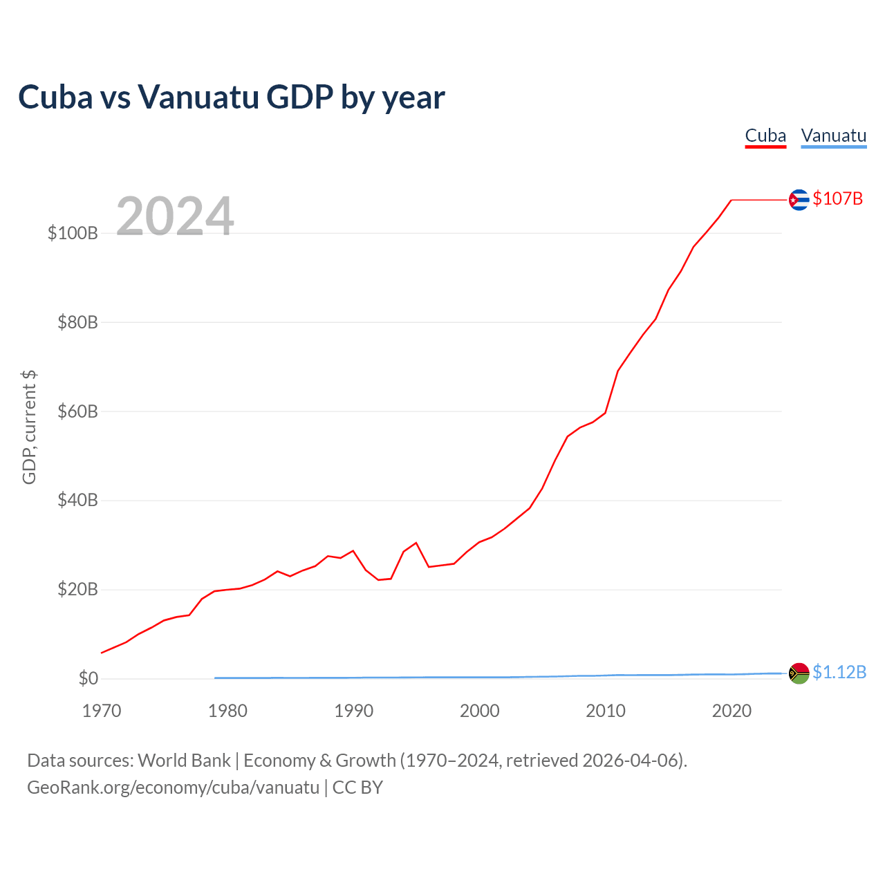 Cuba has a GDP of $107B compared to $1.12B for Vanuatu, ranking 69/197 and 188/197 by economy size, respectively.