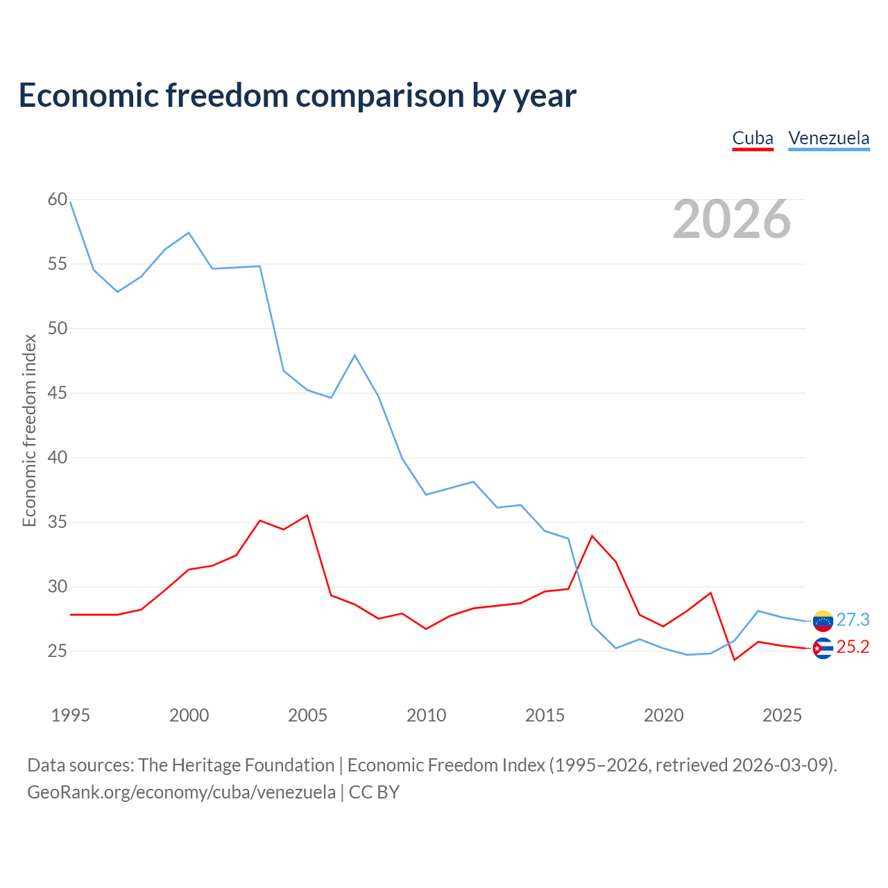 The Economic Freedom Index for Cuba is 25.2, ranking 195/197, compared to 27.3 for Venezuela, ranking 194/197. The chart above displays a comparison of annual changes in economic freedom indexes.
