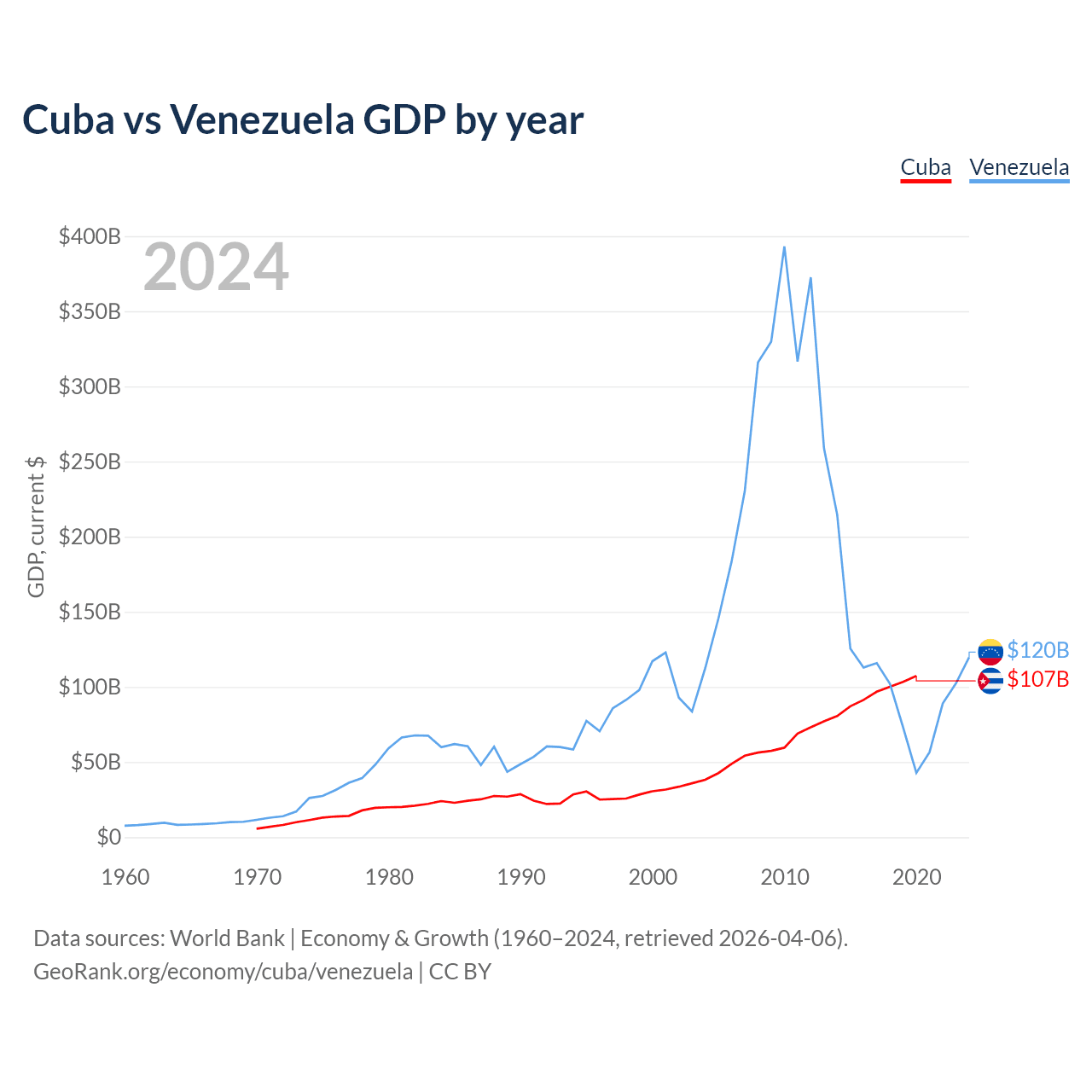 Cuba has a GDP of $107B compared to $120B for Venezuela, ranking 69/197 and 65/197 by economy size, respectively.