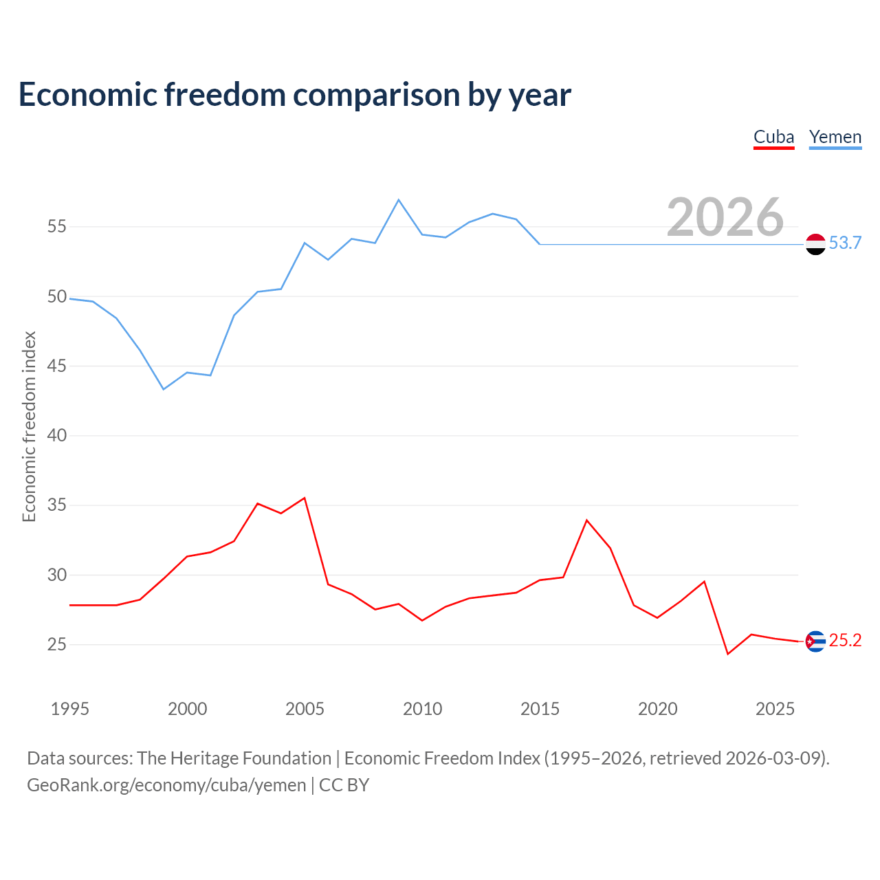 The Economic Freedom Index for Cuba is 25.2, ranking 195/197, compared to 53.7 for Yemen, ranking 138/197. The chart above displays a comparison of annual changes in economic freedom indexes.