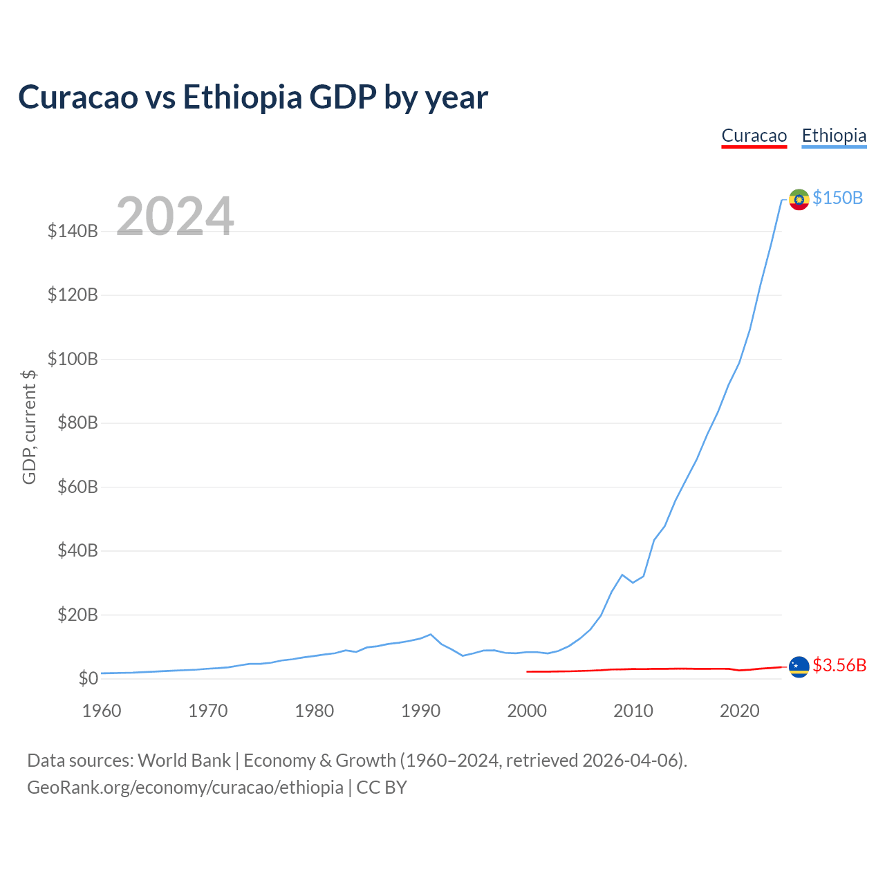Curacao has a GDP of $3.56B compared to $150B for Ethiopia, ranking 167/197 and 60/197 by economy size, respectively.
