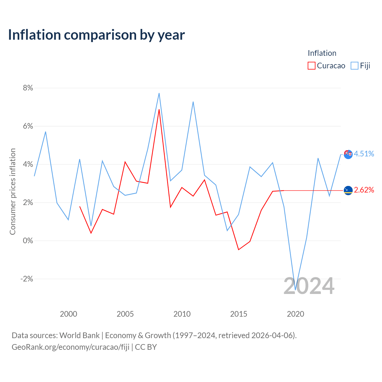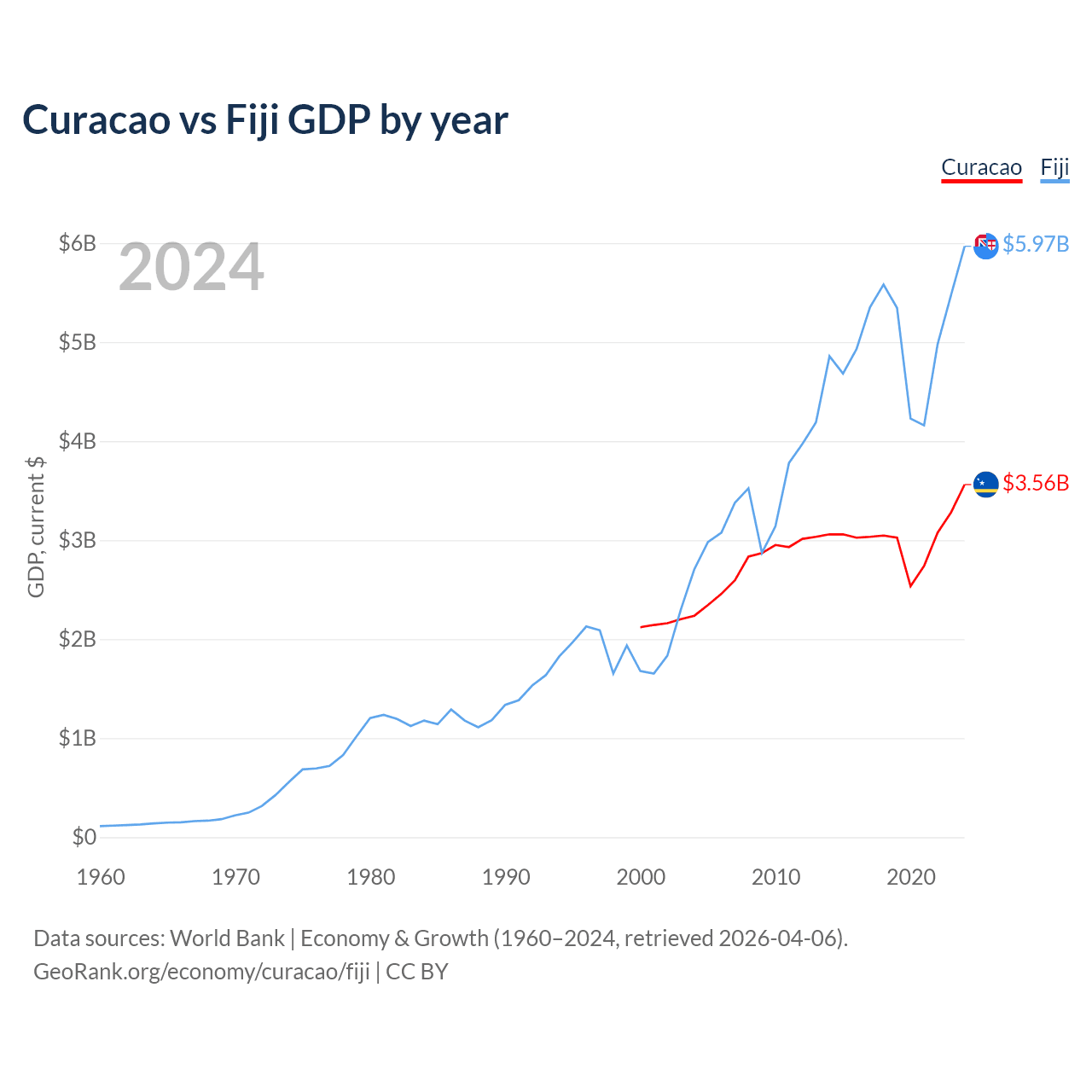 Curacao has a GDP of $3.56B compared to $5.97B for Fiji, ranking 167/197 and 161/197 by economy size, respectively.