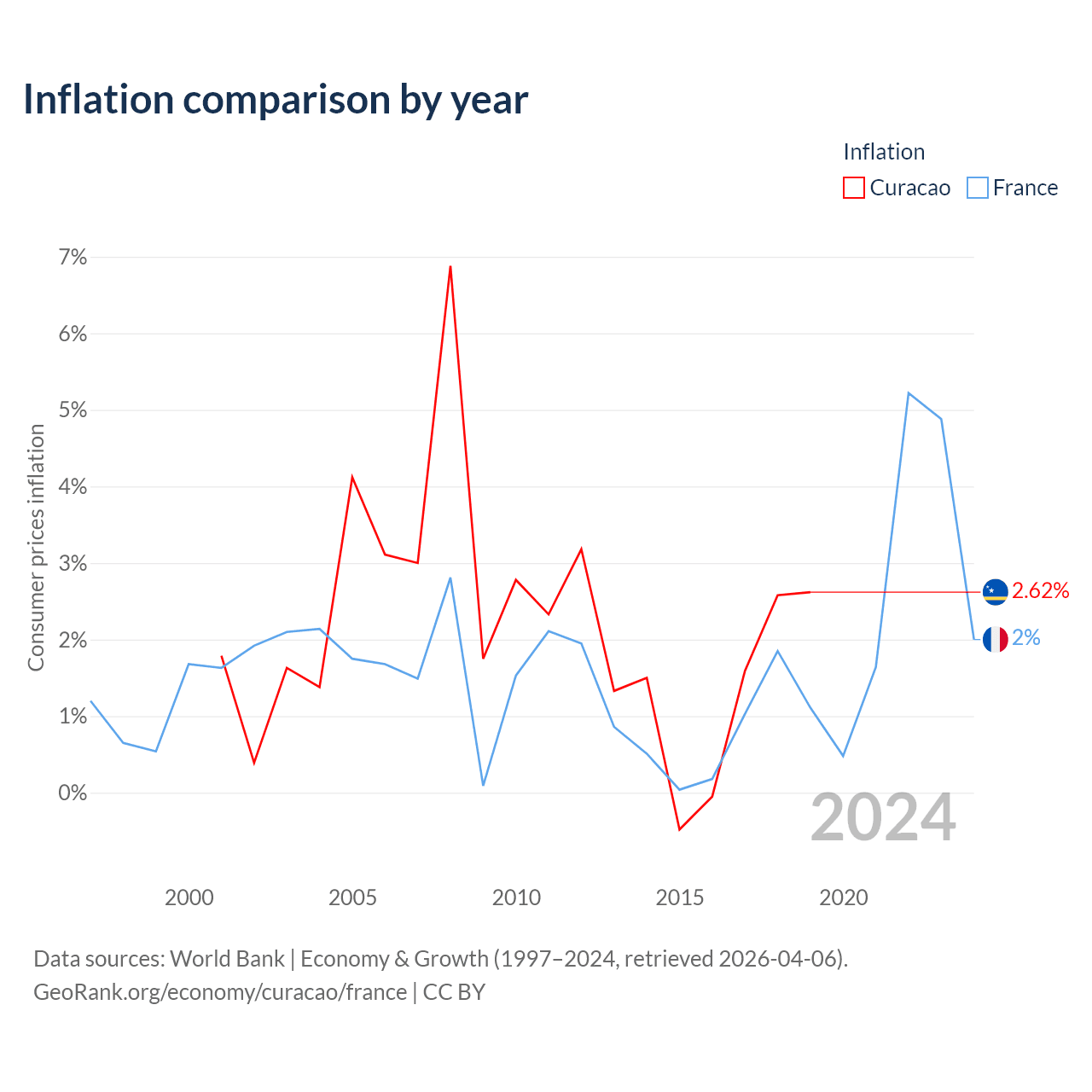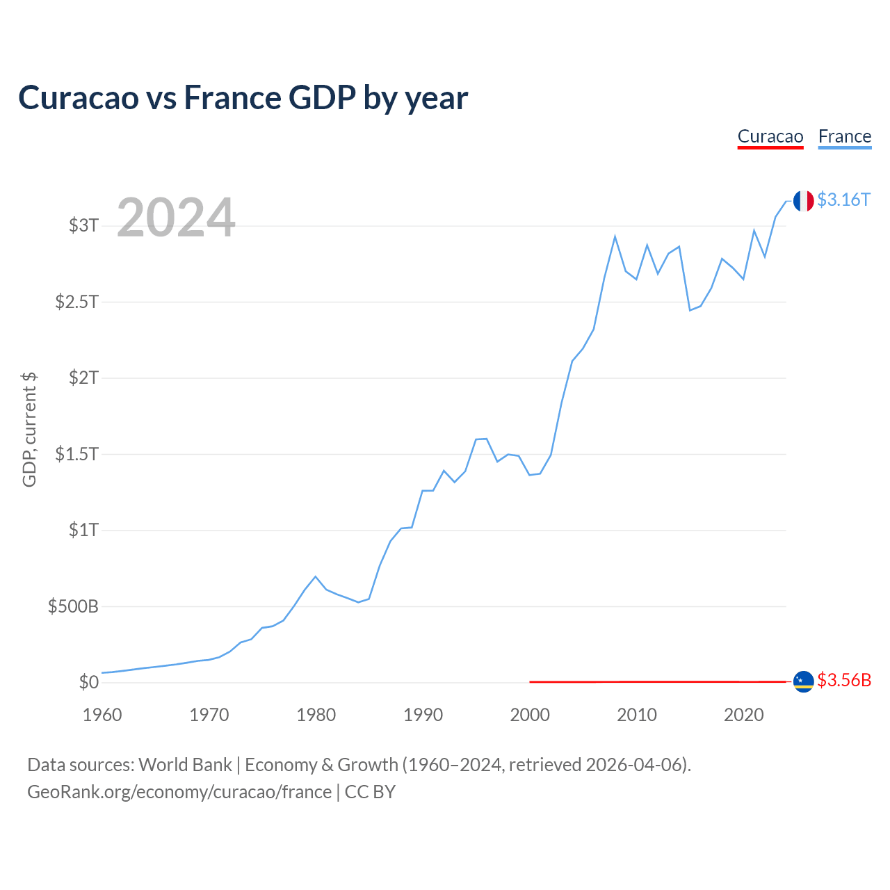 Curacao has a GDP of $3.56B compared to $3.16T for France, ranking 167/197 and 7/197 by economy size, respectively.