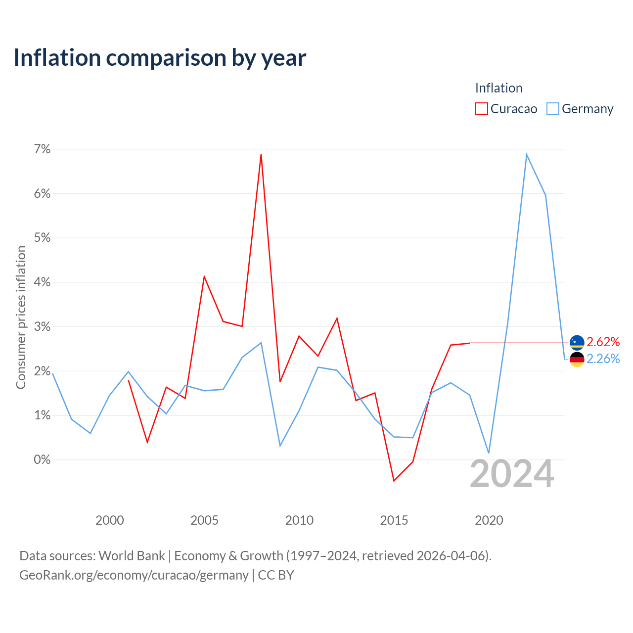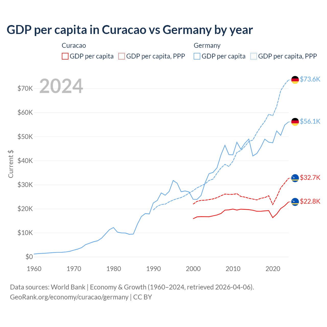 Curacao has a GDP of $3.56B compared to $4.69T for Germany, ranking 167/197 and 3/197 by economy size, respectively.