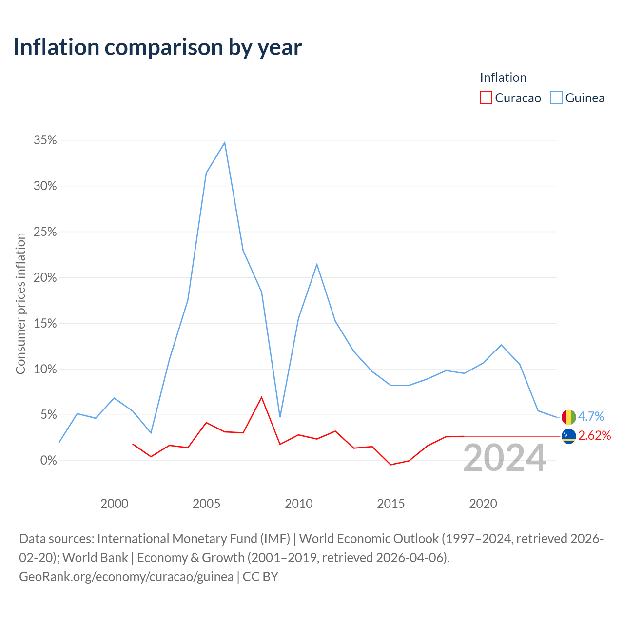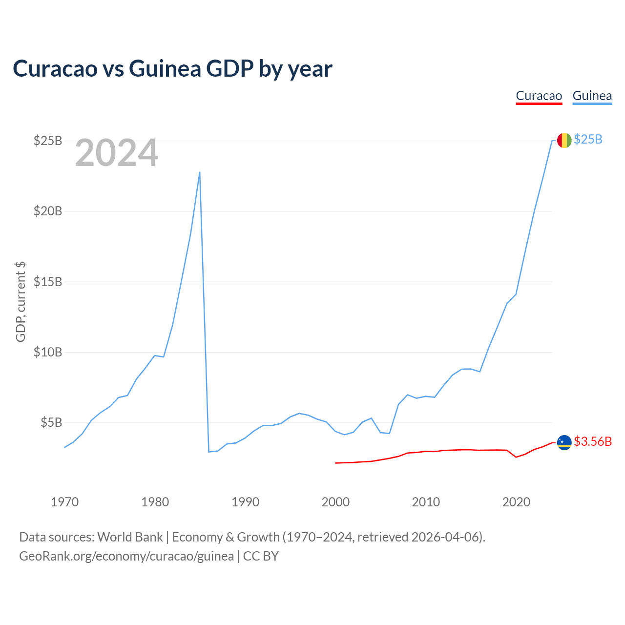 Curacao has a GDP of $3.56B compared to $25B for Guinea, ranking 167/197 and 118/197 by economy size, respectively.