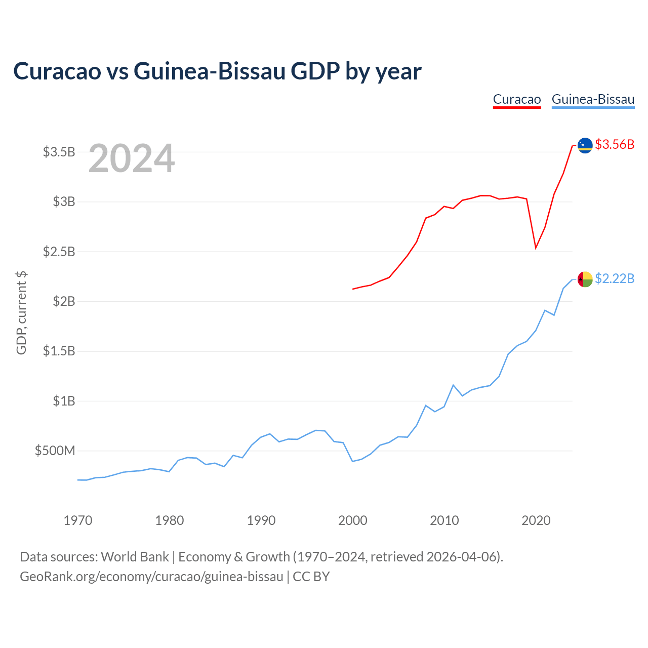 Curacao has a GDP of $3.56B compared to $2.22B for Guinea-Bissau, ranking 167/197 and 176/197 by economy size, respectively.