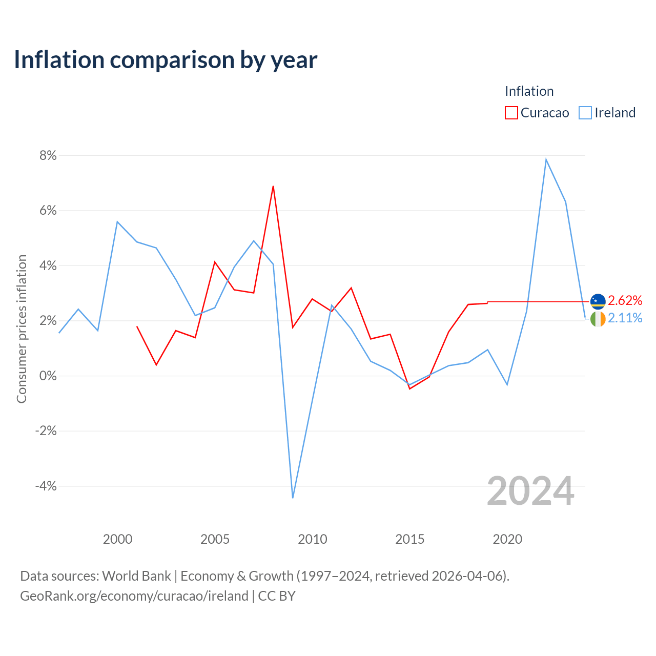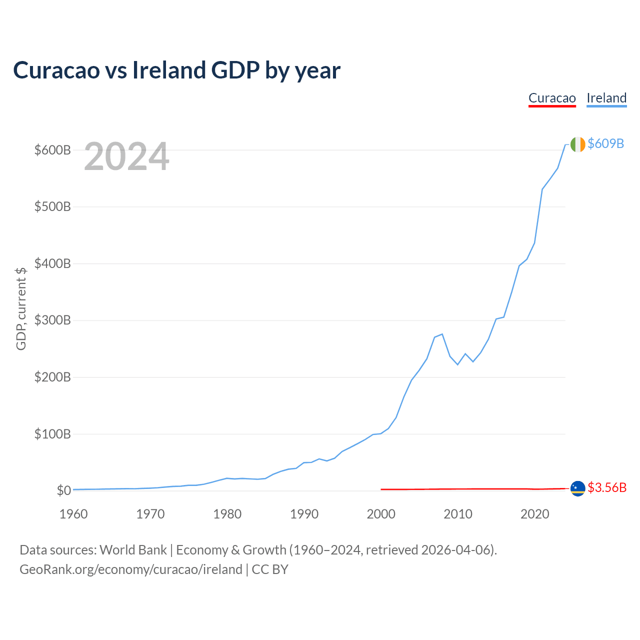 Curacao has a GDP of $3.56B compared to $609B for Ireland, ranking 167/197 and 25/197 by economy size, respectively.