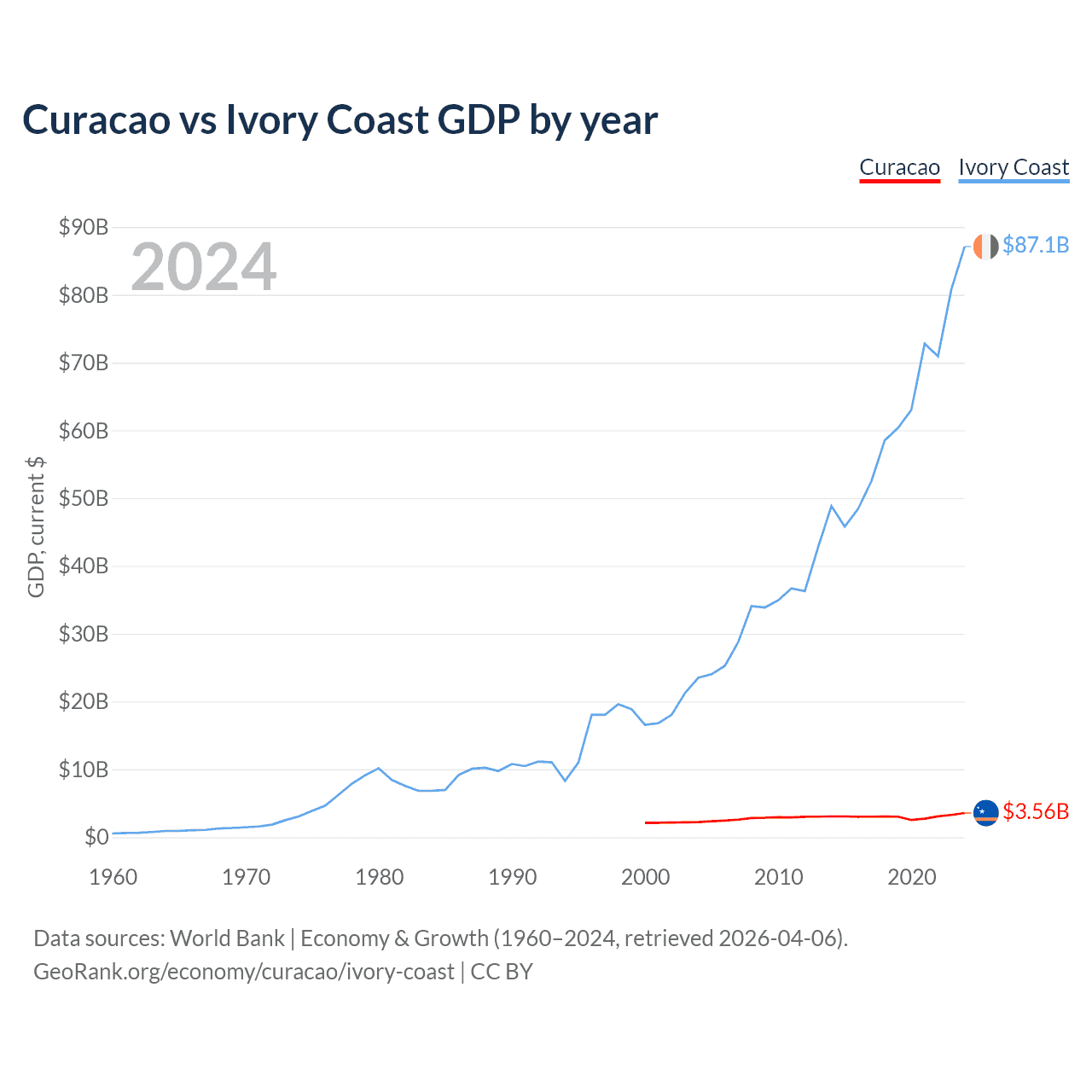 Curacao vs Ivory Coast GDP by year