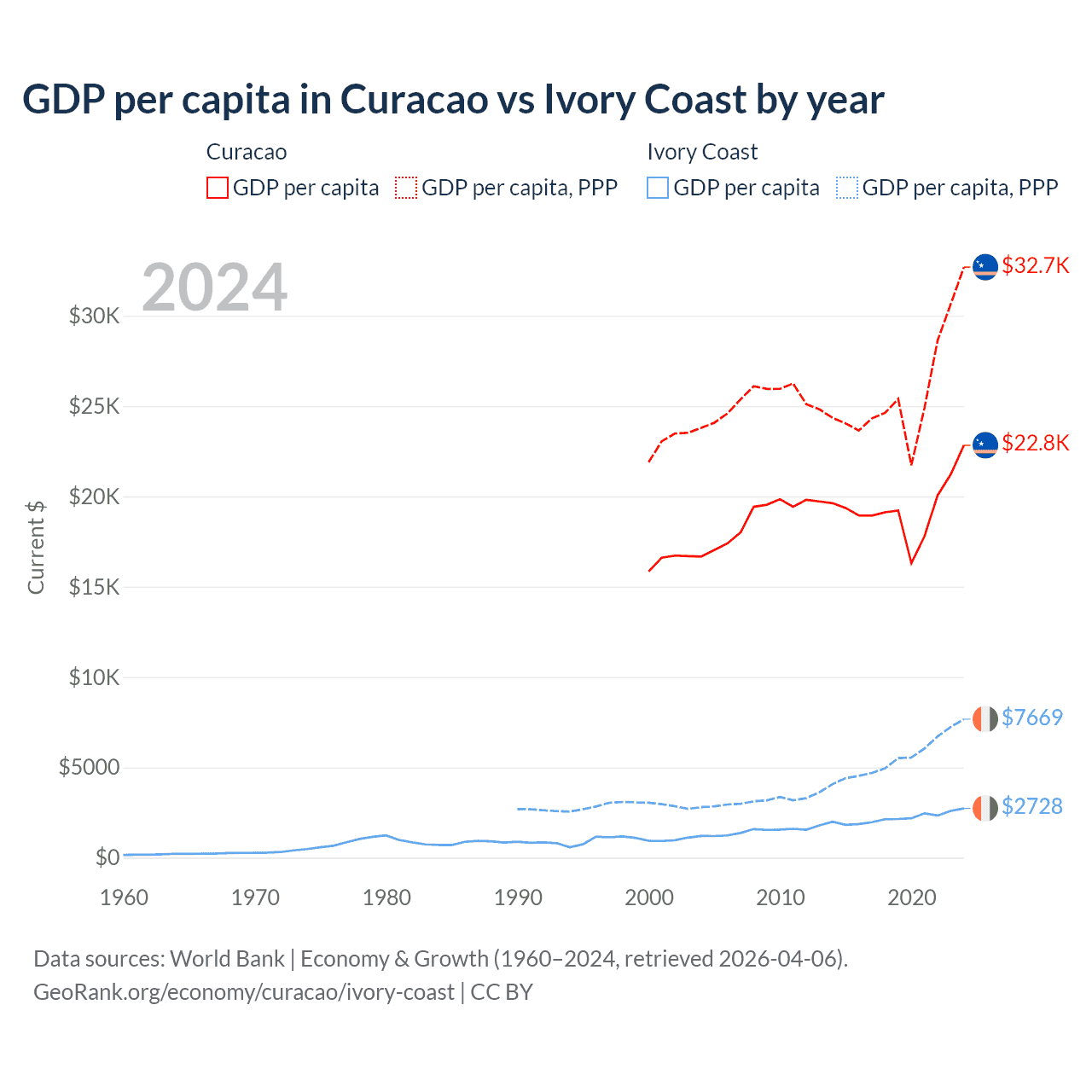 GDP per capita in Curacao vs Ivory Coast by year