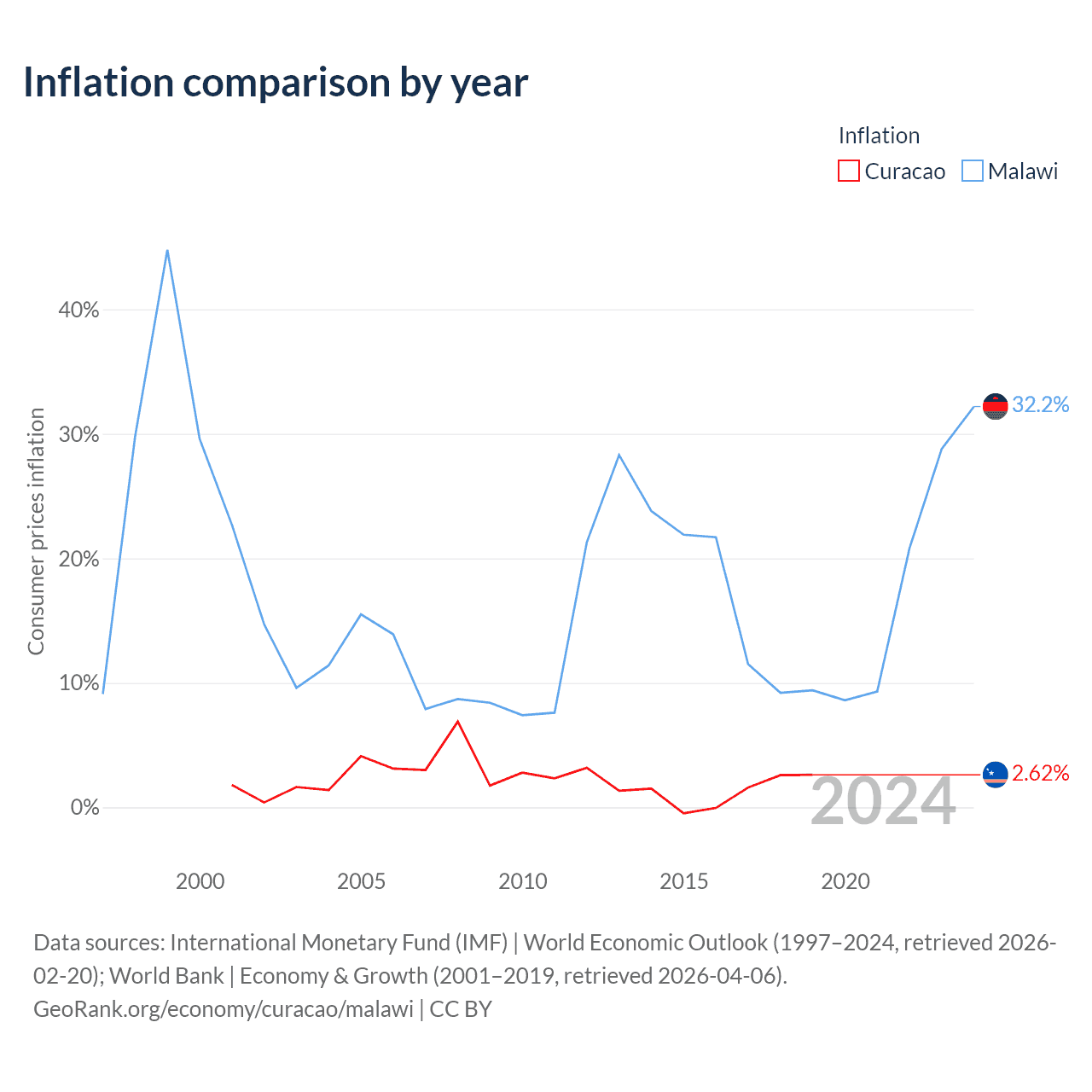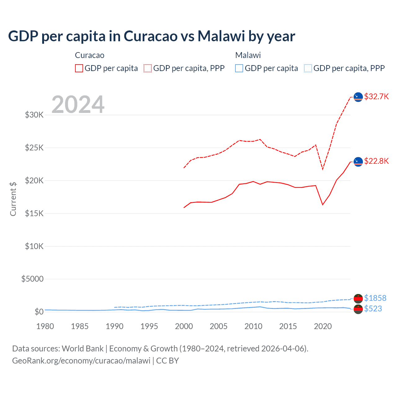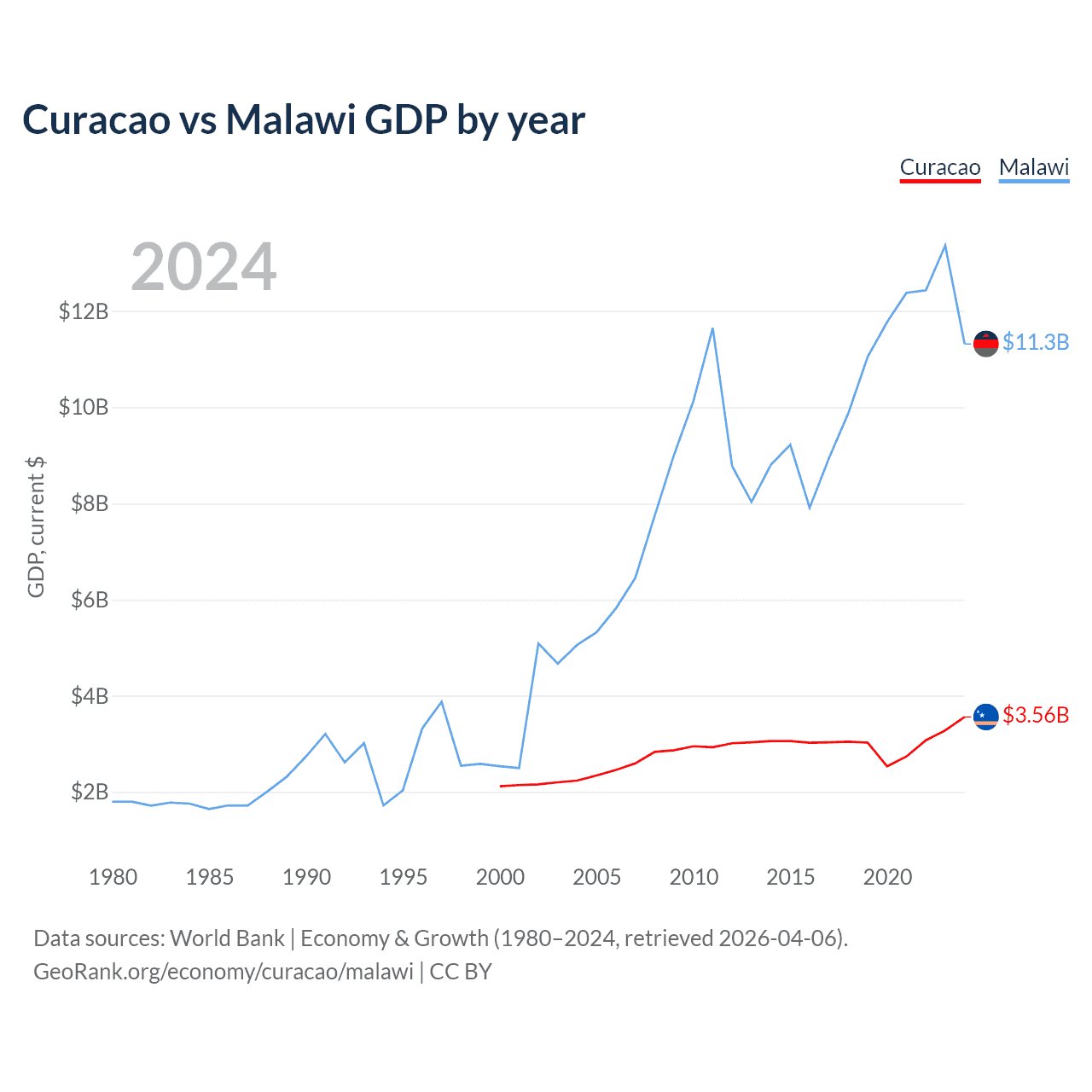 Curacao has a GDP of $3.56B compared to $11.3B for Malawi, ranking 167/197 and 151/197 by economy size, respectively.