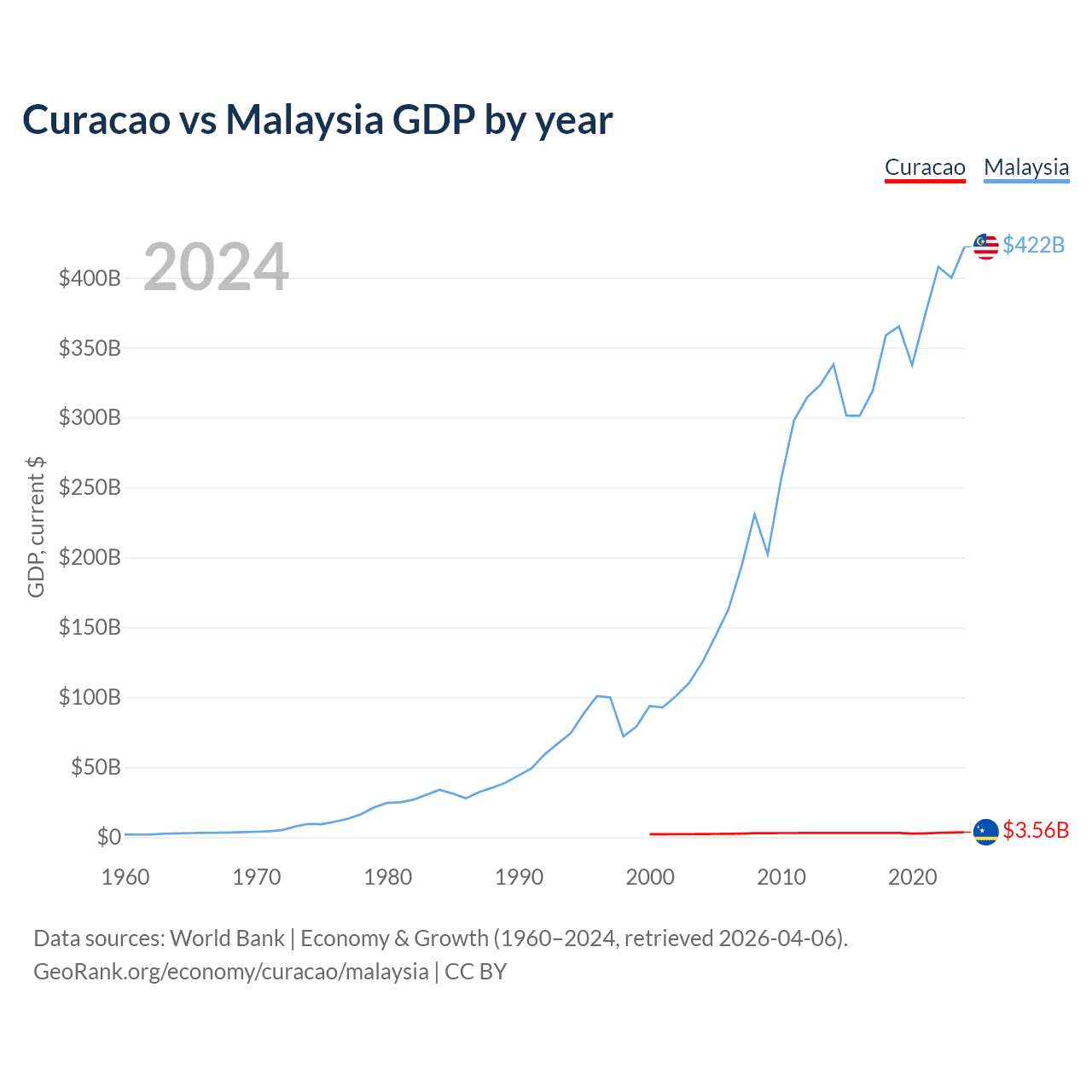 Curacao has a GDP of $3.56B compared to $422B for Malaysia, ranking 167/197 and 38/197 by economy size, respectively.