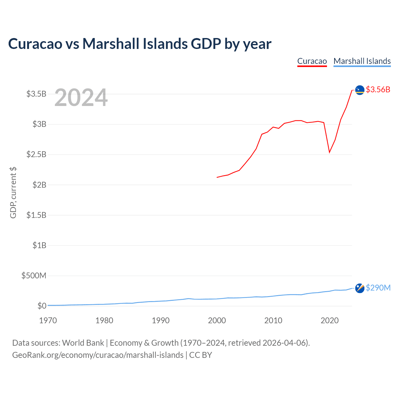Curacao has a GDP of $3.56B compared to $290M for the Marshall Islands, ranking 167/197 and 193/197 by economy size, respectively.