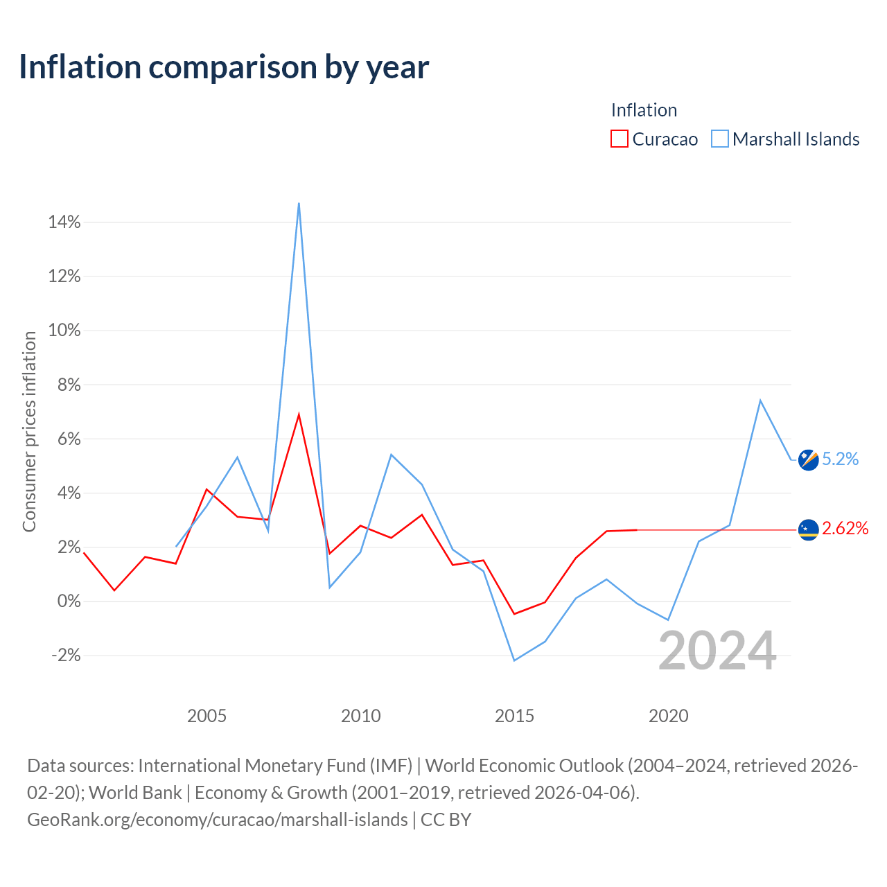 Over the past 16 years, Curacao has recorded an average annual inflation rate of 2.35%, compared with 2.51% in the Marshall Islands. In 2019, inflation was 2.62% in Curacao and 5.2% in the Marshall Islands.