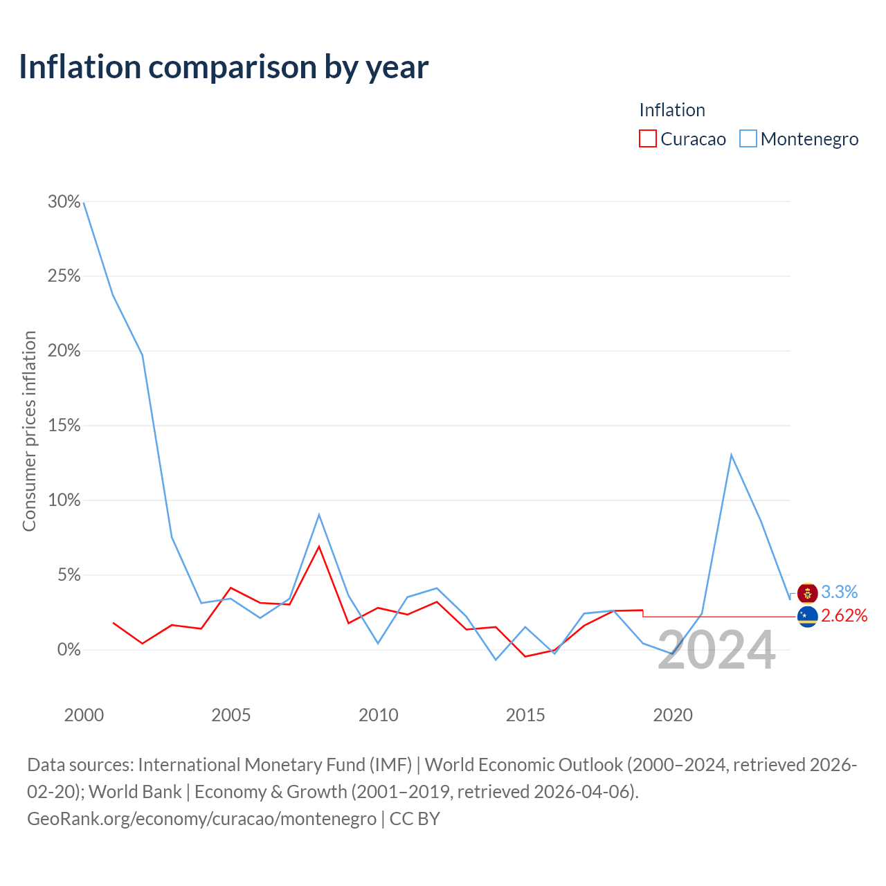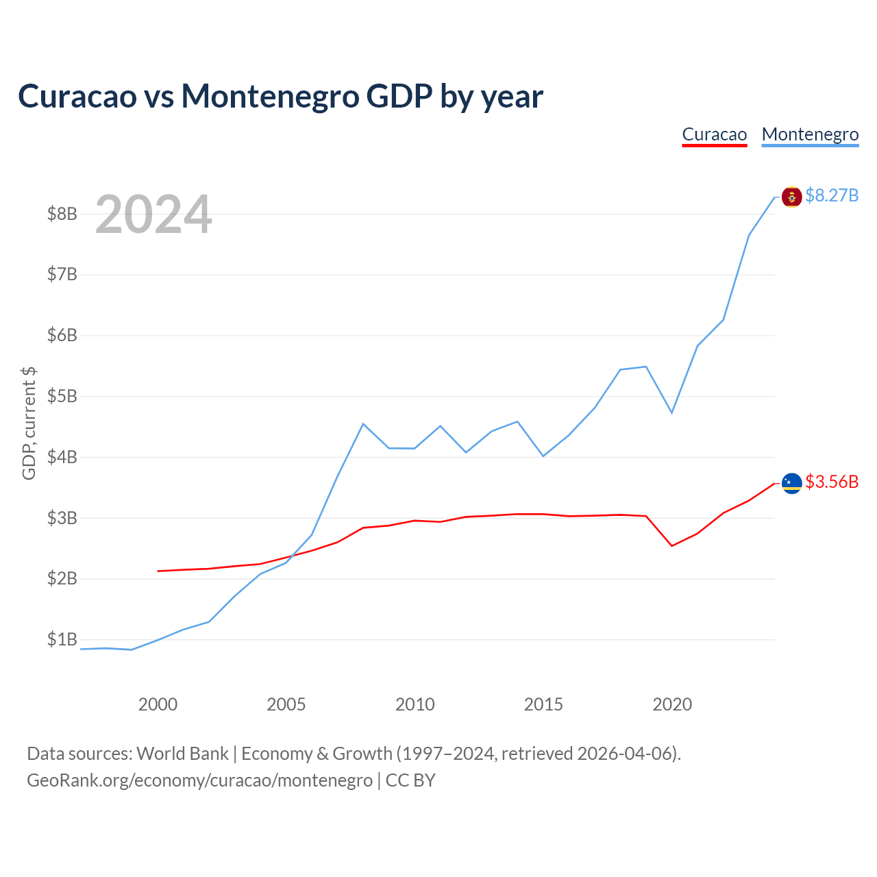 Curacao has a GDP of $3.56B compared to $8.27B for Montenegro, ranking 167/197 and 155/197 by economy size, respectively.