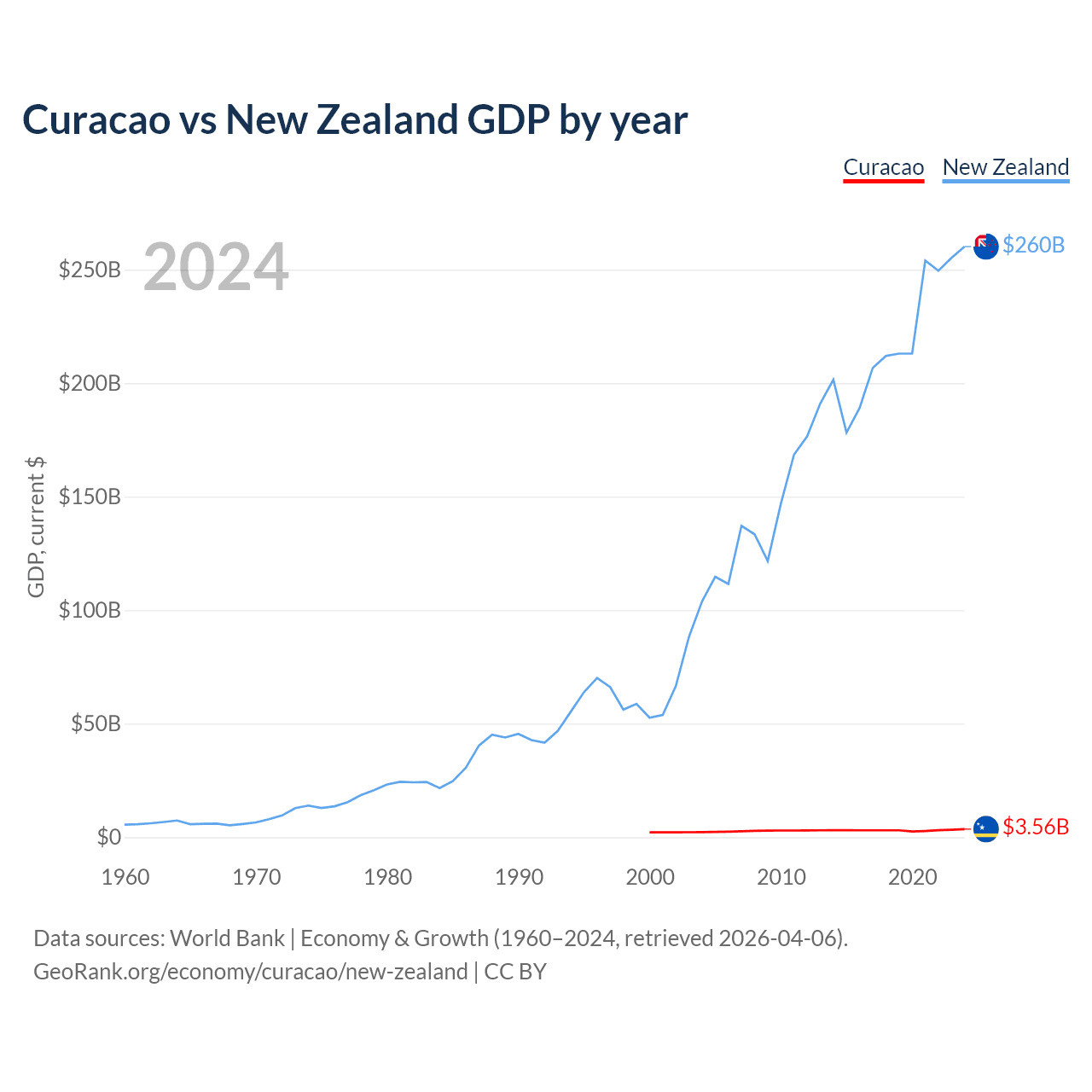 Curacao has a GDP of $3.56B compared to $260B for New Zealand, ranking 167/197 and 52/197 by economy size, respectively.