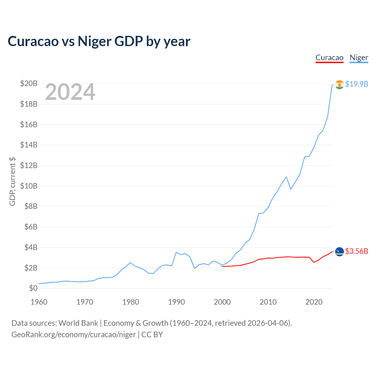 Curacao has a GDP of $3.56B compared to $19.9B for Niger, ranking 167/197 and 130/197 by economy size, respectively.