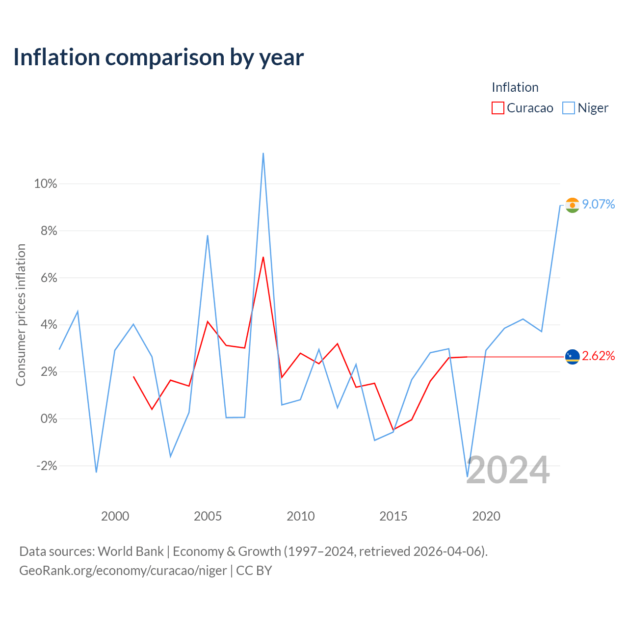 Over the past 19 years, Curacao has recorded an average annual inflation rate of 2.18%, compared with 1.84% in Niger. In 2019, inflation was 2.62% in Curacao and 9.07% in Niger.
