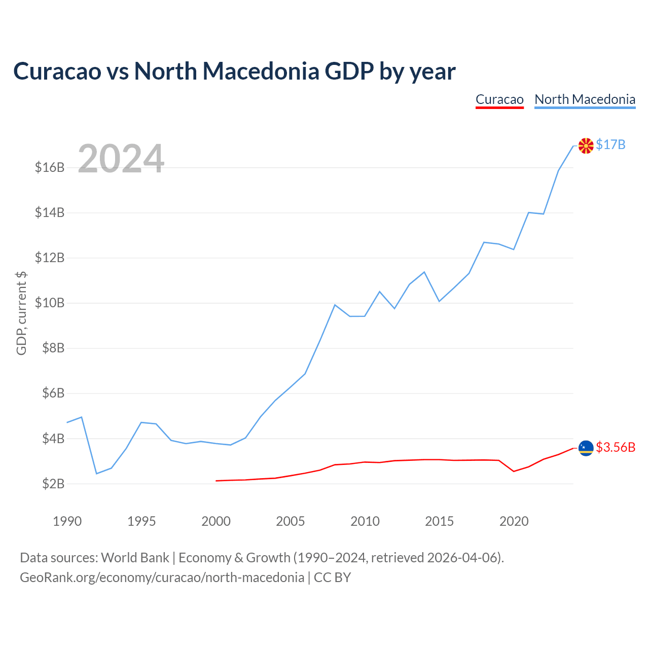 Curacao has a GDP of $3.56B compared to $17B for North Macedonia, ranking 167/197 and 138/197 by economy size, respectively.